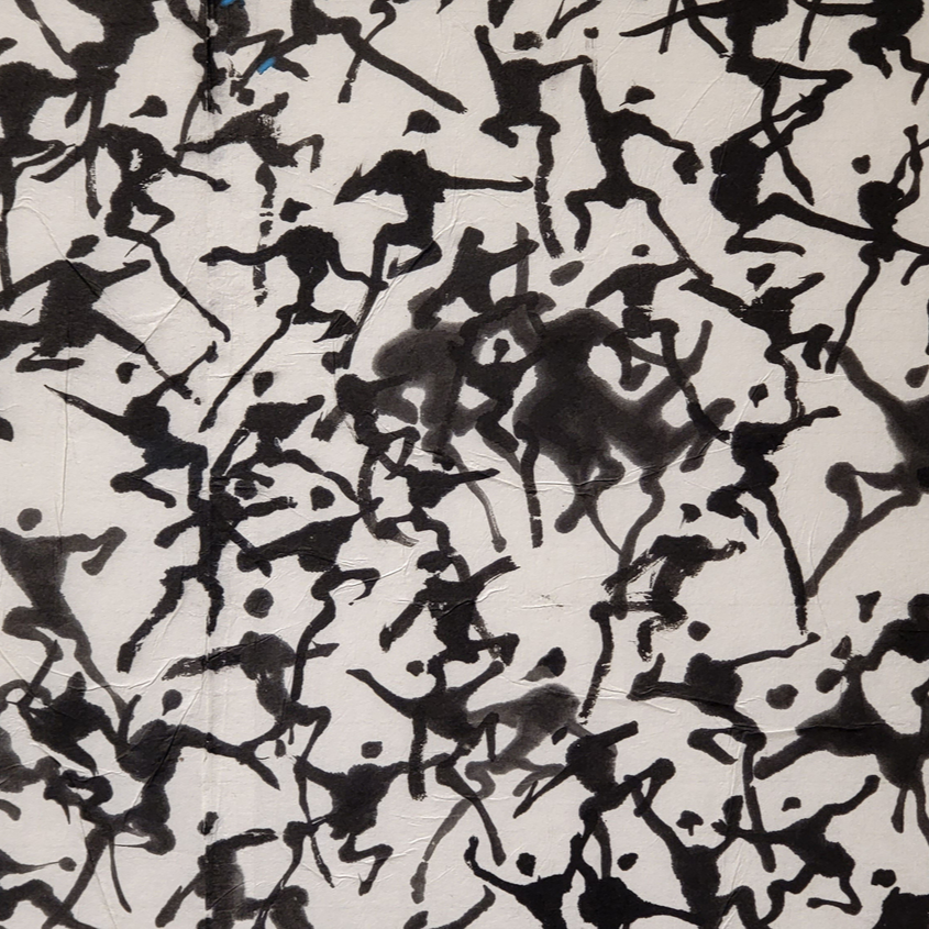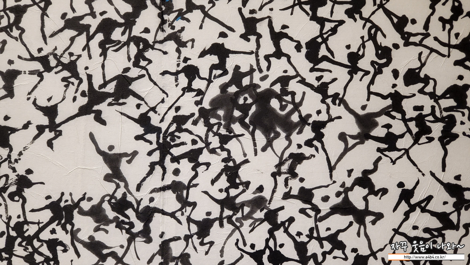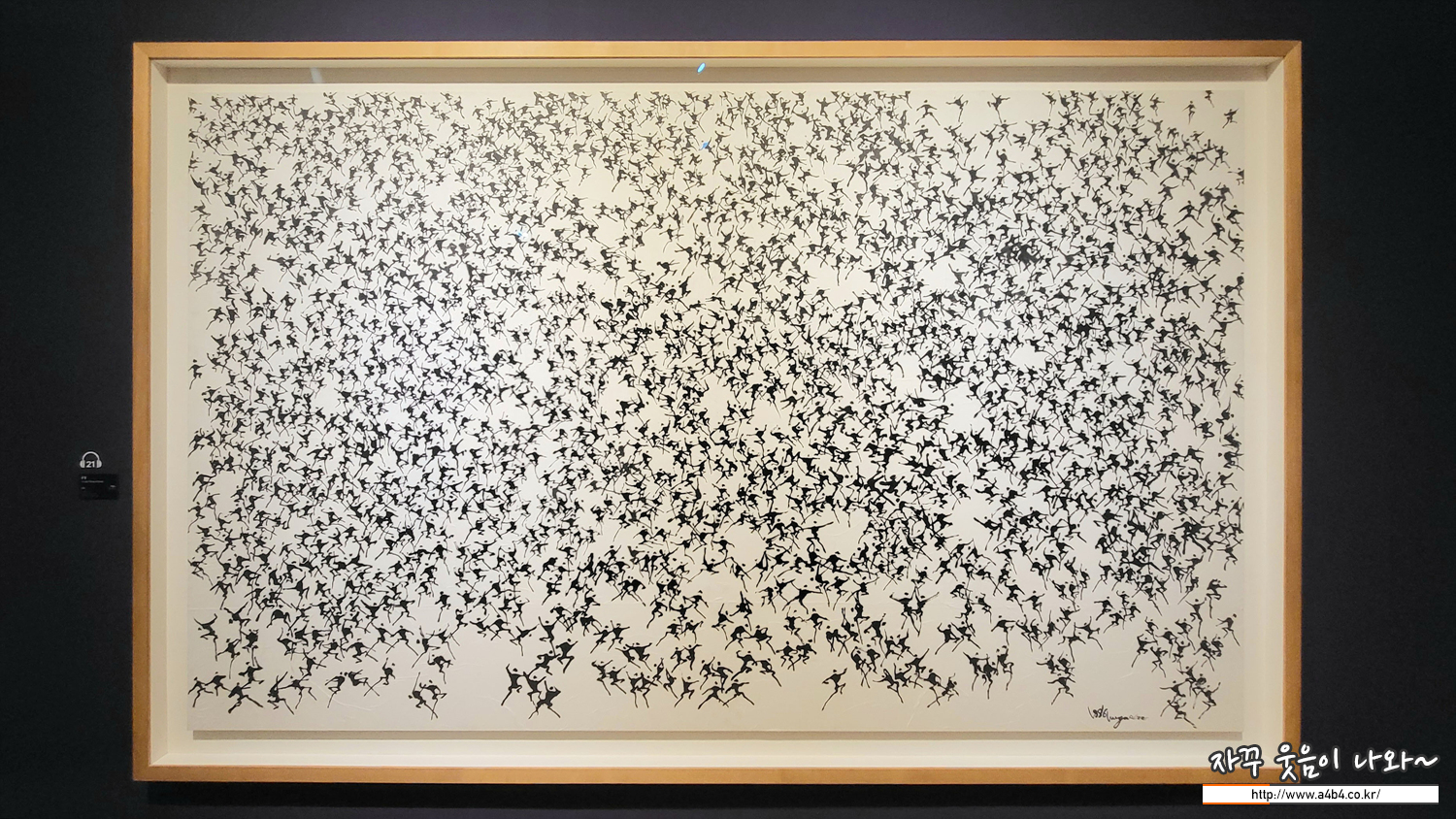 붓으로 글씨 쓰듯 그린 수천 명의 사람들이 집단으로 화폭에 등장합니다. 때로는 분노와 저항의 몸짓으로 시위를 하는 것 같기도 하고, 한편으로는 서로 어울려 춤을 추고 있는 듯합니다. 한 사람 한 사람 동작이 제각각다릅니다. 환희와 분노, 저항의 몸짓이 뒤섞여 있는 것 같습니다. '군상', 즉 '여러 사람의 무리'는 1970년대 후반부터 작고하기 전까지 이응노가 집중했던 주제입니다. 그가 군상에 몰두한 것은 1980년에 발발한 광주 민주화 운동이 계기가 되었습니다. 작가는 군상을 통해 자유에 대한 희구, 인간 존재에 대한 애정, 생명 존중등의 기본정신을 담아냈습니다. 이응노는 조국이 통일 됐을 때 동포들이 기쁜 마음으로 이렇게 춤을 추게 될 것이라고 했다고 합니다. 그래서 군중 시리즈를 '통일무'라고도 합니다.