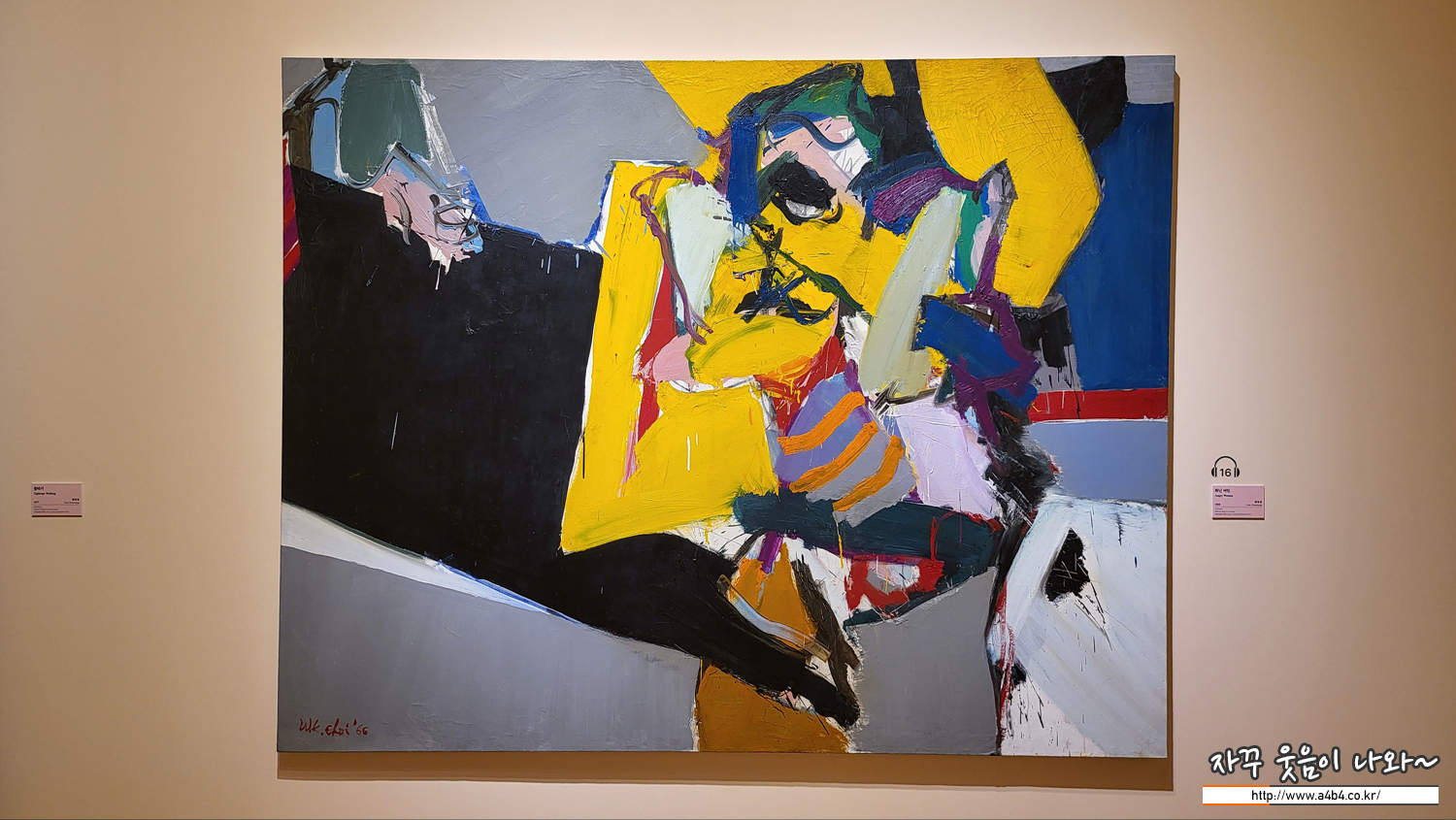 최욱경은 1960년대 미국 크랜부룩 미술아카데미로 유학 가서, 당시 미국 화단을 휠쓴 추상표현주의에 영향을 받은 화가입니다. '화난 여인'은 이러한 작가의 화풍을 확인할 수 있는 작품입니다. 대형 화면에 담은 대담한 구성과 강렬한 색상이 인상적입니다. 검정과 회색조로 커다랑게 면 분할을 해서 그 위에 배치된 노랑, 빨강, 파랑의 선명한 원색을 안정적으로 받쳐줍니다. 여기에 거침없는 붓질과 나이프를 활용해 넓게 펴 바른 면이 역동성을 더합니다. 흑백과 화려한 색상을 적절히 대비한 색상 실험은 미국 시절 초기 초기 작품에서 자주보이는 특징입니다.