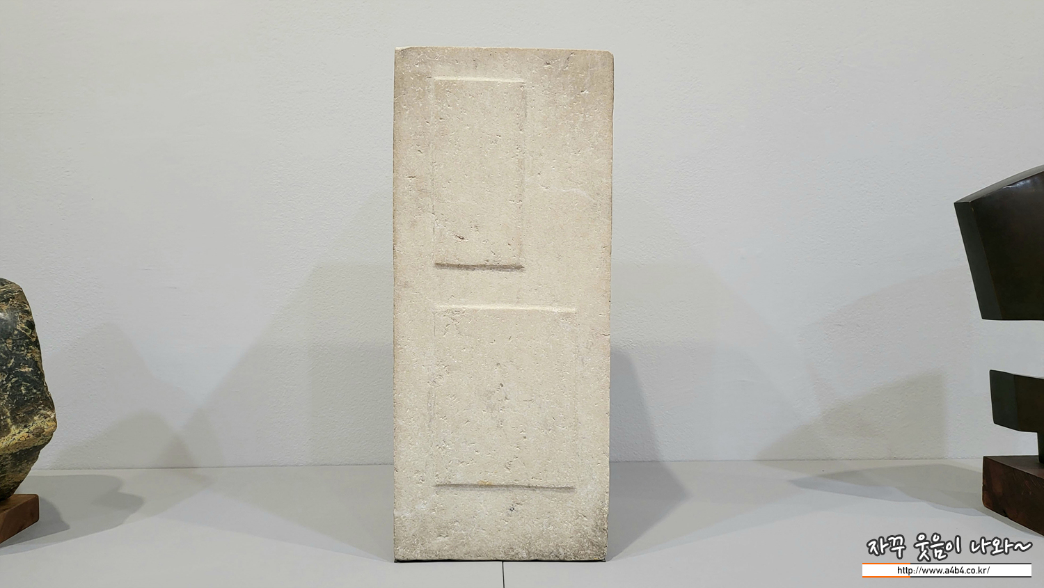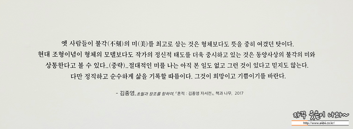 얼핏 보면 묘비석처럼 보이기도 하는 이 조각은 '한국 추상 조각의 선구자'인 김종영의 작품입니다. 흰색을 띠는 직육면체의 석재 표면에 돋을새김으로 사각의 면을 나타냈습니다. 김종영은 지나치게 다듬는 행위를 절제해 재료의 간결하면서도 견고한 구조적인 아름다움을 드러내는 데 집중했습니다. 깊이 있는 사유와 통찰을 바탕으로 자연의 질서에 접근하고자 했던 작가의 조형관이 엿보이는 작품입니다. 김종영은 '불각의 미'를 조형 철학으로 삼았습니다. '깍지 않는다'는 의미이기도 하지만 '깎지만 부단히 깎지 않는 상태를 지향한다'는 얘기입니다. 그는 평생 선비와 같은 태도로 생명의 근원을 탐구했습니다.