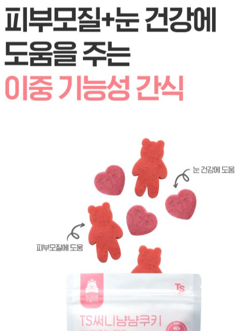 TS써니 냠냠쿠키는 공통으로 강아지의 피부모질을 개선하고 노란색 패키지는 장케어, 초록색 패키지는 관절 케어, 핑크색 페키지는 눈케어에 도움되는 간식이라고 합니다.