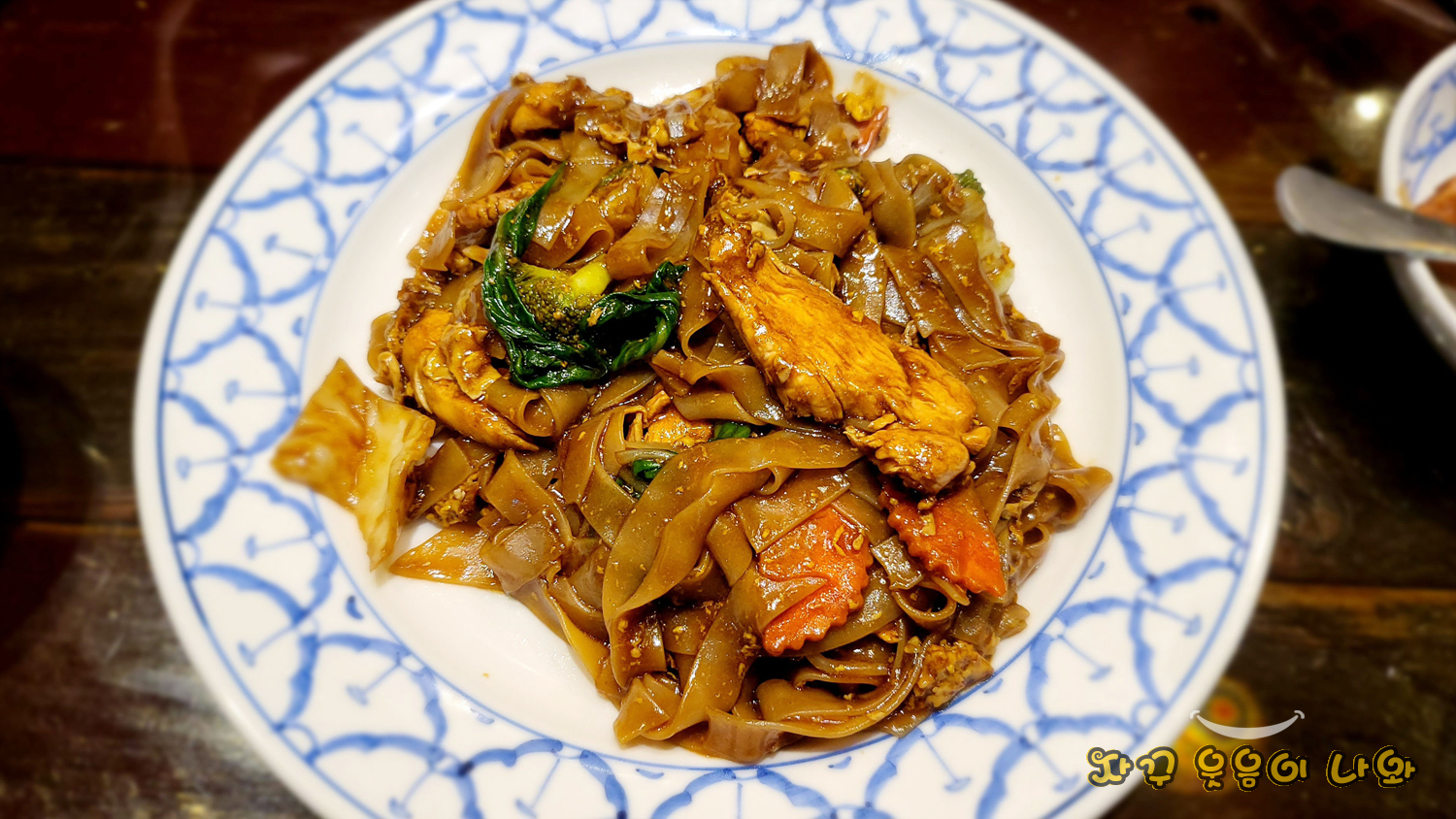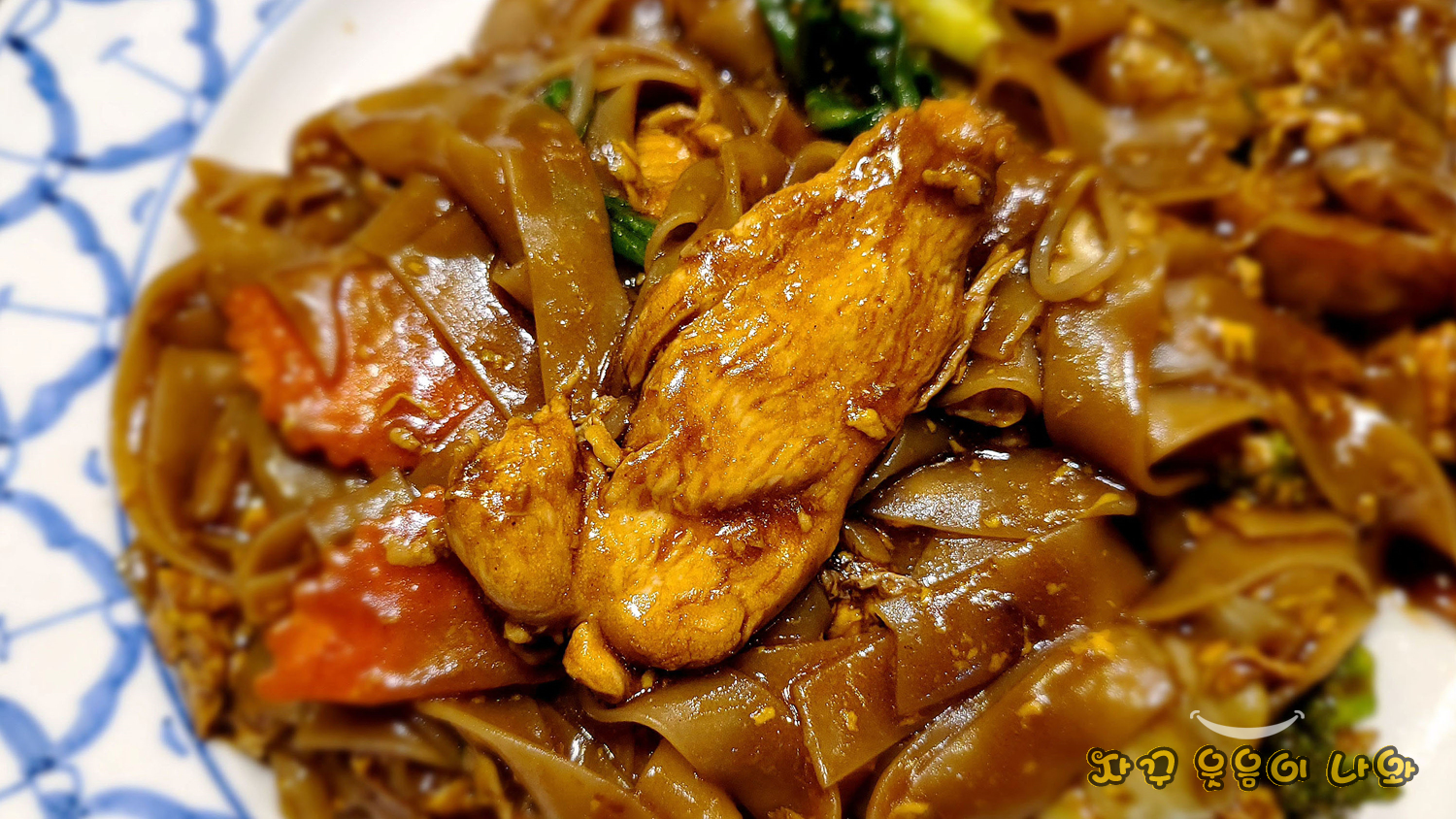 넓직한 쌀국수와 닭고기를 달달한 카라멜소스와 간장으로 볶은 쌀국수 입니다. 태국요리 입문자 또는 이런 요리가 익숙하지 않으신 분에게는 무난한 메뉴로 추천 드립니다.