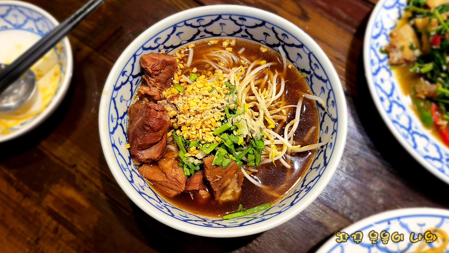 태국식 쇠고기 쌀국수 입니다. 오랜 시간 우려낸 진한 육수와 큼직한 쇠고기가 듬쁙 올라간 쌀국수 입니다.