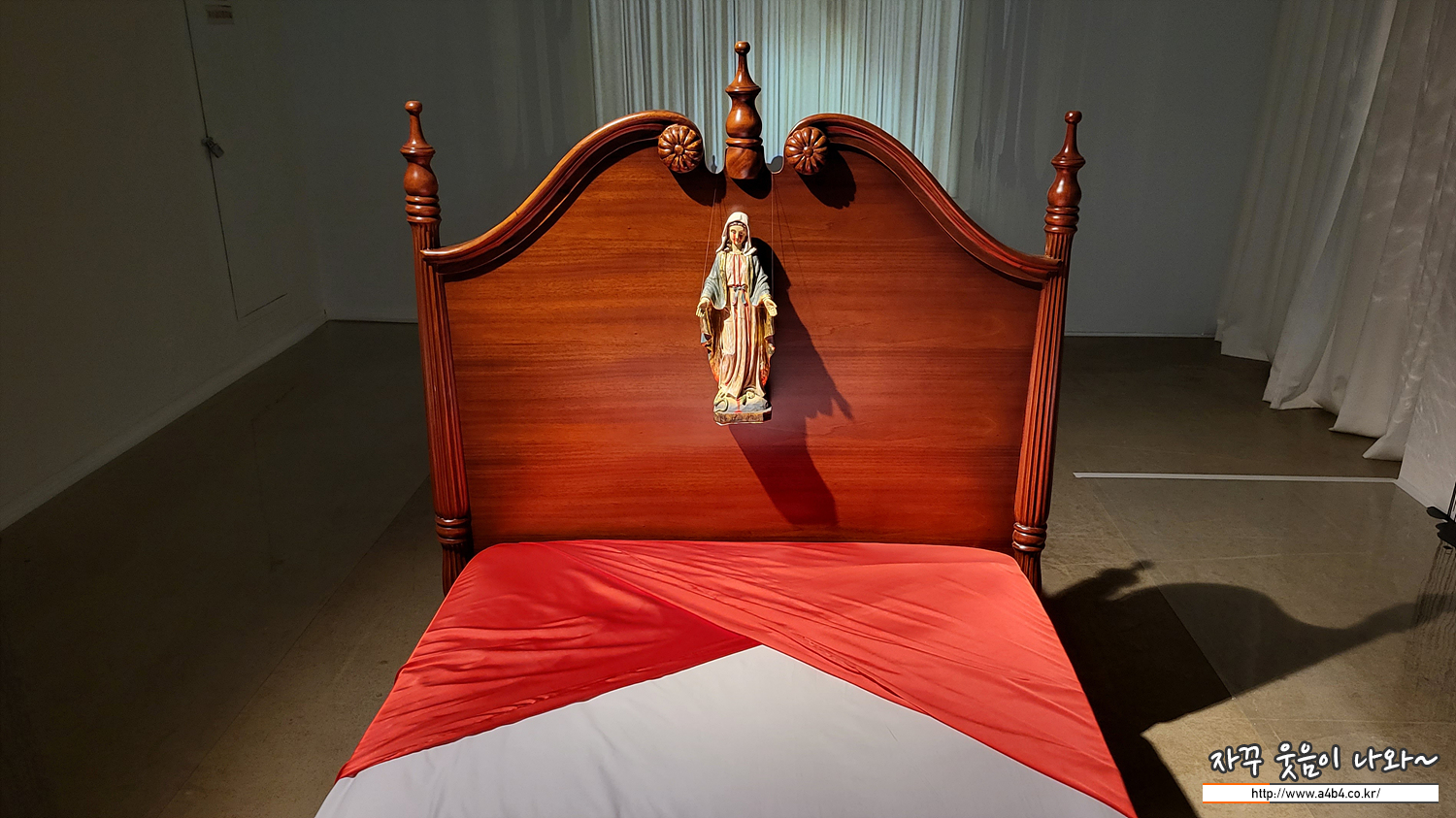 앞부분으로 이동하면, 말보로의 담배갑을 표현한 침대와 침대 위에 걸려있는 성모 마리아상이 보이네요.
