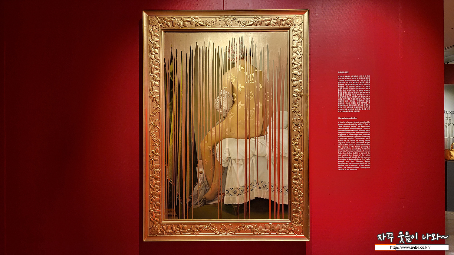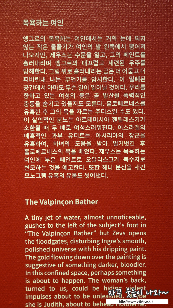 앵그르의 목욕하는 여인에서는 거의 눈에 띄지않는 작은 물줄기가 여인의 발 왼쪽에서 뿜어져 나오지만, 제우스는 수문을 열고, 그의 페인트를 흘러내리며 앵그르의. 매끄럽고 세련된 우주를 방해한다. 그림 위로 흘러내리는 금은 더 어듭고 더 피비린내 나는 무언가를 암시한다. 이 밀폐된 공간에서 아마도 무슨 일이 일어날 것이다. 우리를 향하고 있는 여성의 등은 곧 발산될 폭력적인 충동을 숨기고 있을지도 모른다. 홀로페르네스를 유혹한 후 그의 목을 자르는 주디스일 수도 있다.