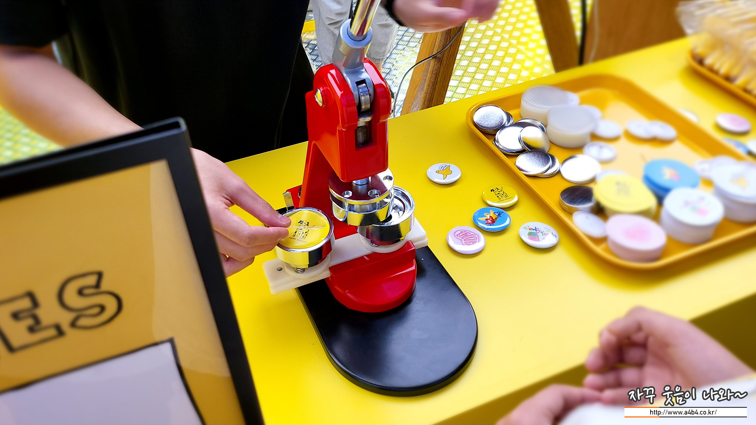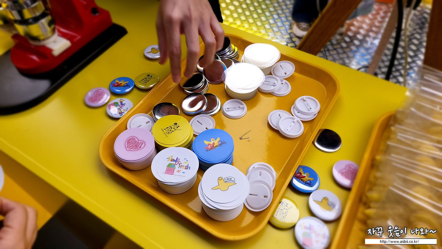 다섯가지 도안이 있고요. 여기서 마음에 드는 도안을 선택하고 즉석으로 아트웍 핀버튼을 만들 수 있습니다. 직원 분께서 세팅해 주시면 직접 기계를 눌러서 제작이 가능합니다. 저희는 이렇게 3개를 제작했네요