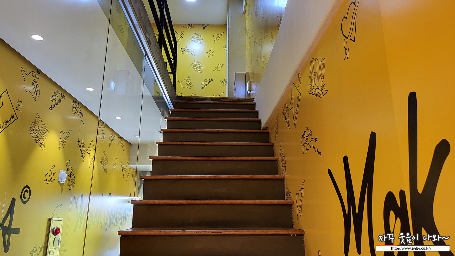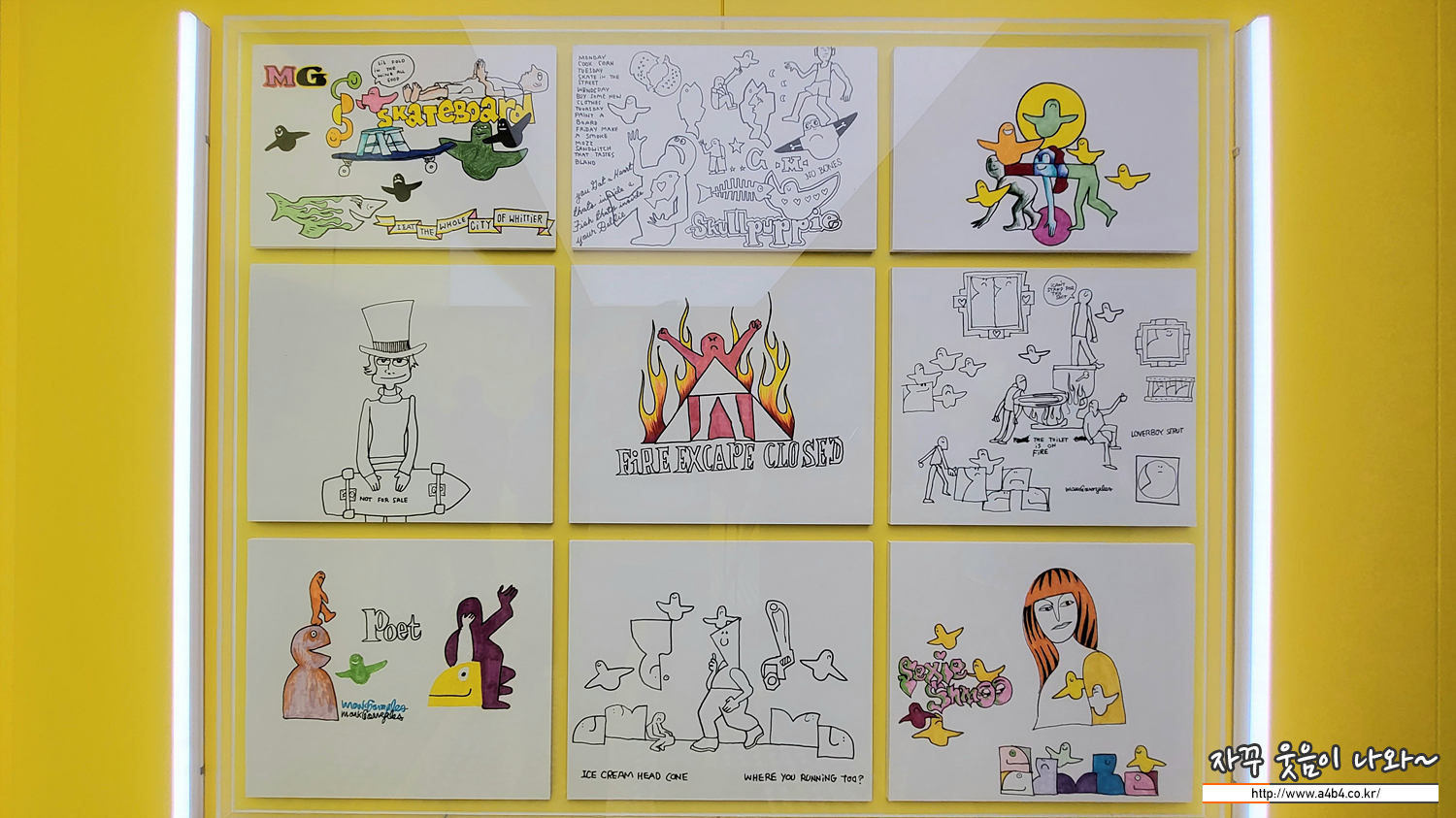 마치 자동차 세차장을 연상하게 하는 인테리어와 그가 직접 그린 두들들이 보이네요. 본인의 이름도 한글로 쓰기도 하고요. 현지화 패치 잘 된 사업가라는 생각이.