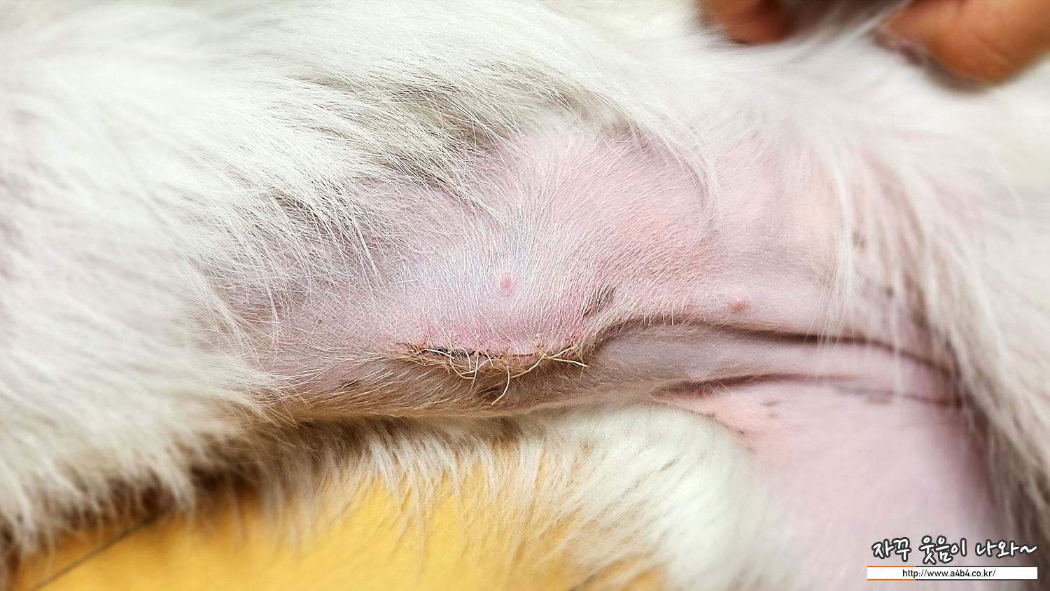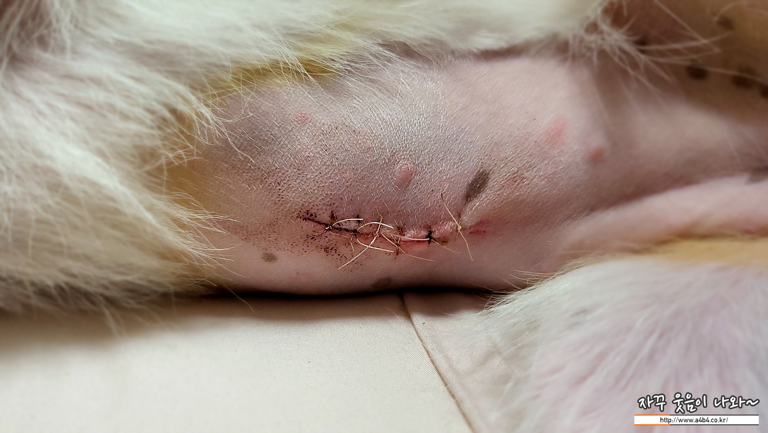 워낙 활발한 녀석이어서 그런지 수술 당일 저녁에 바로 붕대가 풀렸습니다. 수술 후 봉합한 자리가 생각보다 큽니다.