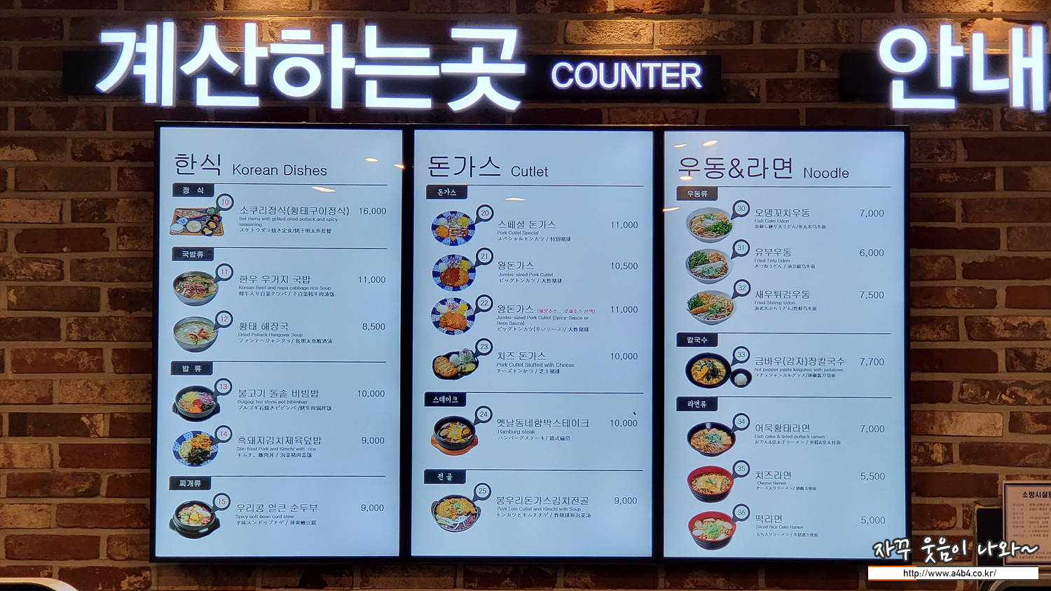 * 우동 & 라면 : 꼬치우동, 유부우동, 새우튀김우동이 있고요. 장칼국수, 어복황태라면, 치즈라면, 딱리면이 있습니다. 우동 가격은 7천원 전후, 라면 가격은 5천원 전후입니다.