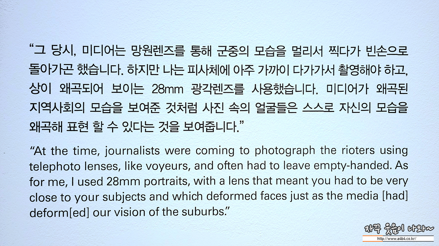 그러나 미디어를 통해 그려진 모습과는 달리, 당시 시위에 가담하지 않은 청년들도 있었고, 동네에 배치된 군인들로 인해 일상 생활 유지에 어려움을 겪는 청년들도 있었습니다. 당시 언론이 멀리서 주민들을 촬영해 지역 상황을 보도하려 한 것과 달리, 제이알은 28미리 광각 렌즈를 사용해 사람들을 가까이에서 담고자 했습니다.