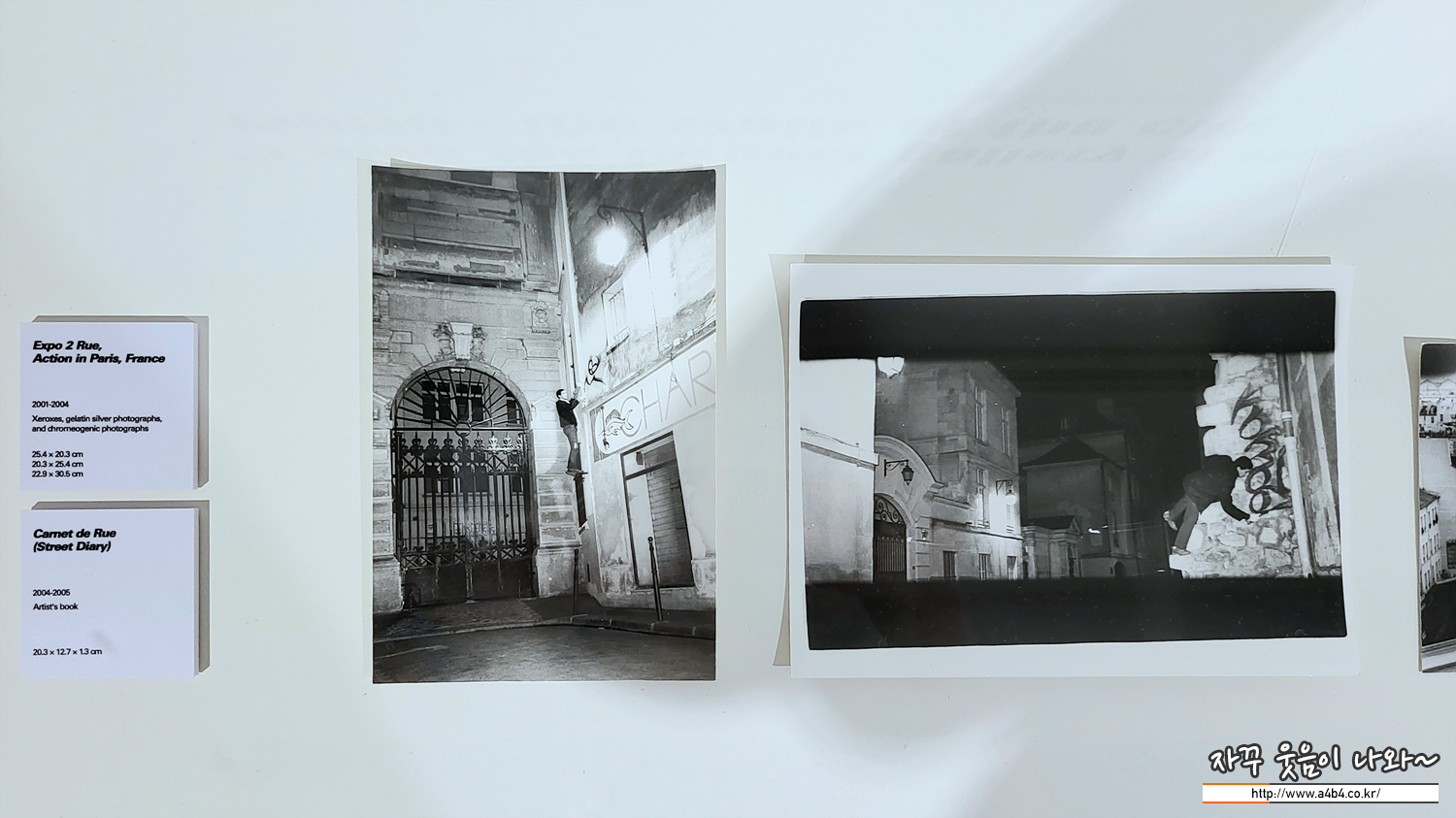 < 거리 전시회 > 는 그래피티 아티스트로 활동하던 제이알의 첫 번째 사진 프로젝트입니다. 제이알은 지하철역에서 카메라를 주운 것을 계기로 사진 작업을 시작하게 됩니다. 친구를 기다리던 제이알은 우연히 벤치 위에 놓인 가방을 발견합니다. 한참이 지나도 주인이 나타나지 않아 가방을 열어보았더니 카메라가 들어있었습니다. 렌즈도 바꿀 수 없고, 필름과 작은 배터리 두 개만 넣으면 되는 오래된 카메라였습니다. 파리 곳곳에 자신의 이름을 새기며 그래피티에만 열중하던 제이알은 말로는 설명하기 어려운 생동감 있는 거리 모습을 기록하기 위해, 카메라를 들고 친구들의 모습을 찍기 시작합니다.