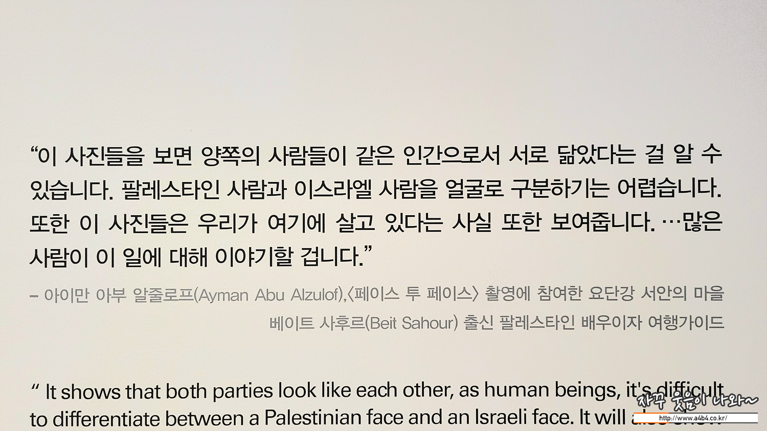 2005년 친구 마르코와 함께 팔레스타인과 이스라엘을 방문한 제이알은 두 번째 공공 프로젝트인 <페이스 투페 이스 > 를 시작합니다. 사진에서는 교사나 의사, 운동선수, 예술가 등 직업을 가진 팔레스타인과 이스라엘 사람들의 얼굴을 보여줍니다. 사람들은 누가 팔레스타인인인지 아니면 이스라엘인인지 쉽게 구분하지 못했지만, 격렬한 교전이 벌어지고 있던 당시 두 지역 사람들은 강한 적대감을 가지고 서로를 다르다고 생각했습니다. 직트.하지만 제이알은 프로젝트를 진행하면서 두 지역 사람들과 가깝게 소통하게 되고 나서, 그들에 대한 고정관념이 서 서히 사라지게 됩니다.