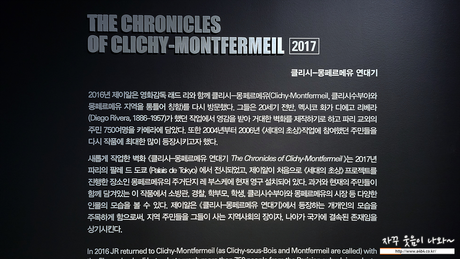 제이알이 최근 진행하고 있는 대형 벽화 프로젝트는 멕시코 아티스트 디에고 리베라의 벽화에서 영감을 받아 시작했습니다. 제이알의 벽화 프로젝트로써 처음 제작된 < 클리시-몽페르메유 연대기 )는 과거 <세대의 초상>을 진행했던 프랑스 클리시-몽페르메유 지역에 대한 이야기 입니다.
