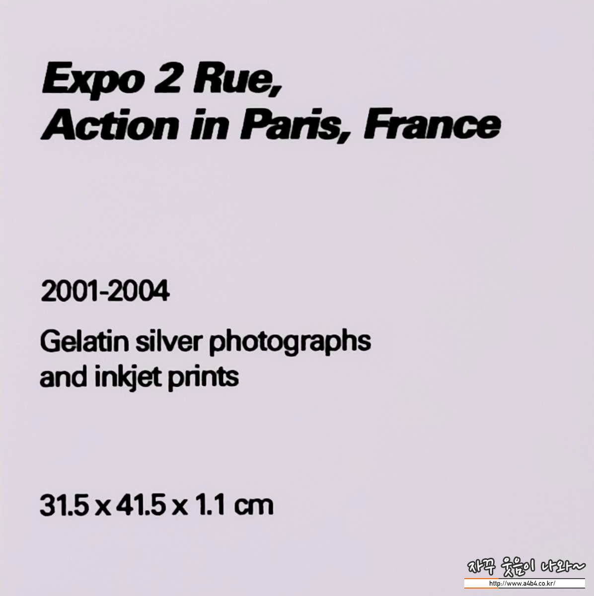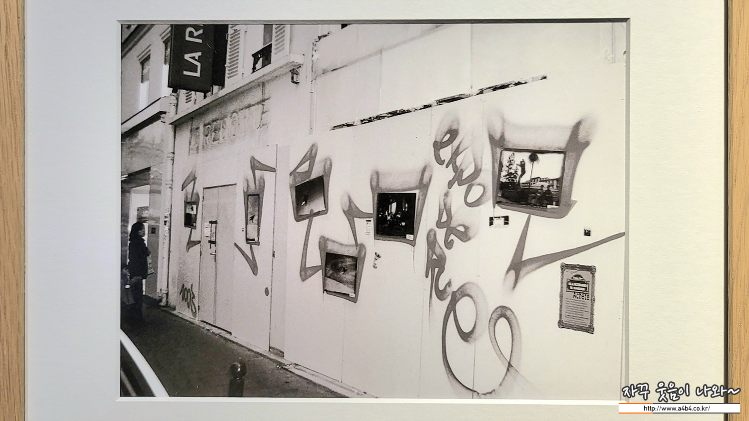 작가는 작은 크기의 흑백 사진을 사람들 눈에 잘 뛰도록 여러 장으로 이어 붙인 뒤, 빨간 스프레이로 테두리를 그리고 불어로 엑스포 두 휘 (Expo 2 Rue)를 써서 본인의 사인을 남겼습니다. 바스키야의 왕관이 생각나는...