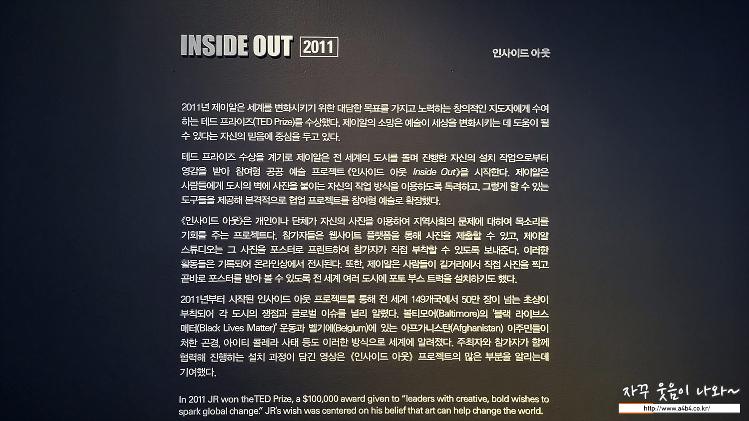 2011년 테드 프라이즈를 수상한 제이알은 무대에 올라 세상을 바꿀 수 있는 아이디어를 사람들과 공유할 수 있는 기회를 얻게 됩니다. 작가는 청중을 작업에 참여시킬 수 있는 공공미술 프로젝트 < 인사이드 아웃 ) 을 기획하게 됩니다. 제이알은 누구든지 사진을 찍어서 제이알 스튜디오로 보내면 사진을 출력해서 전 세계 어디로든 무료로 보내주기 시작했습니다. 그렇게 전 세계 141개 국가에 40여만 장의 사진 포스터가 발송되었고 현재도 많은 사람들이 이 프로젝트에 참여하고 있습니다. 제이알은 < 인사이드 아웃 > 을 진행하면서 세상에 자신을 표현하고 무언가를 시도하고 싶어하는 사람들이 많다는 사실을 깨닫게 됩니다. 전시장 벽면을 채운 여러 대의 모니터에서 재생되고 있는 영상은 < 인사이드 아웃 > 에 참여한 사람들의 기록이자 전 세계 다양한 도시에서 프로젝트를 진행한 사람들의 모습을 보여주고 있습니다