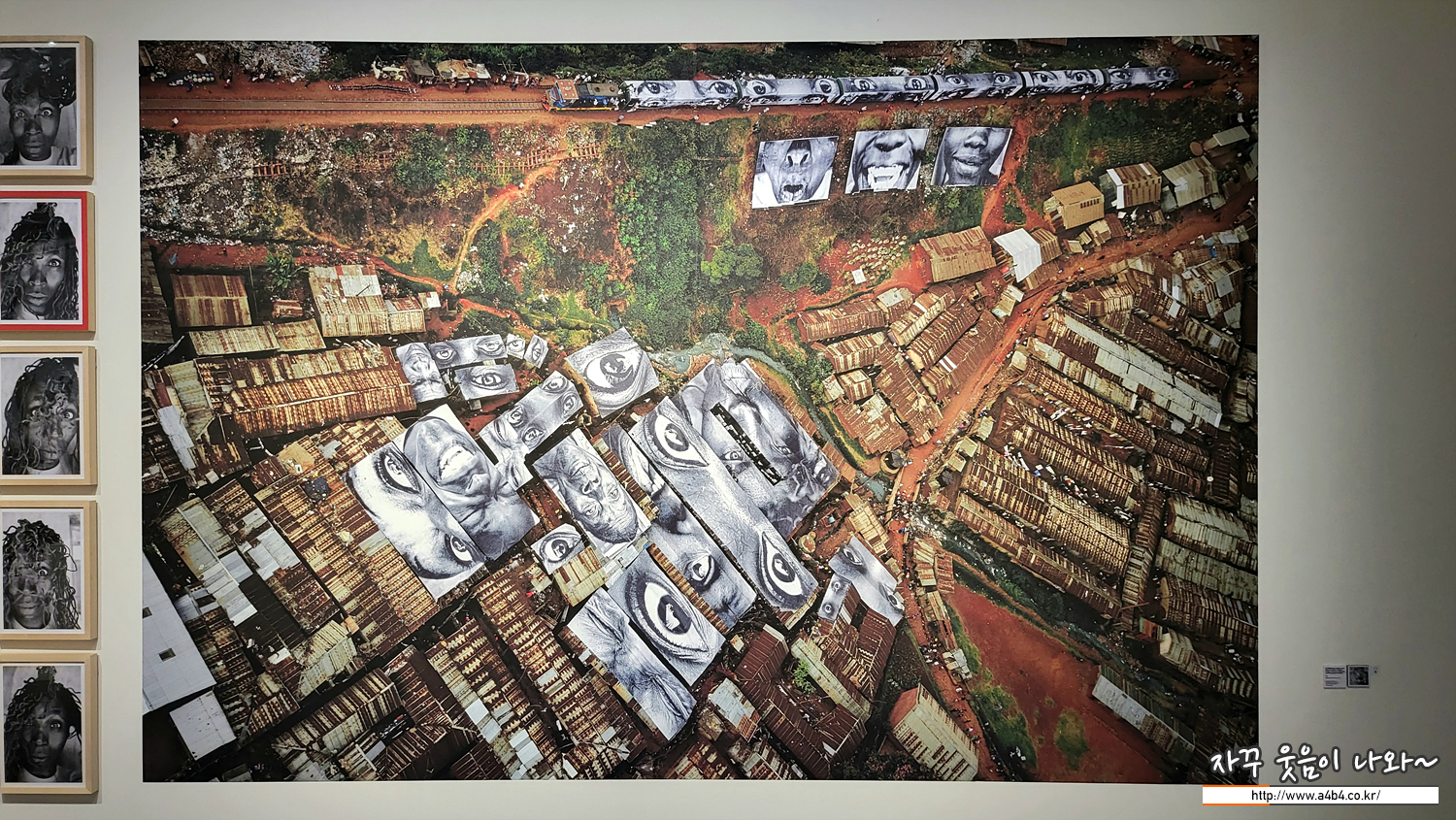 라이베리아 프로젝트 이후, 제이알은 케냐 나이로비에 있는 슬럼가 '키베라'에 가서 <여성은 영웅이다 > 를 진행합니다. 키베라에 도착한 작가는 두 가지를 깨닫게 됩니다. 첫째는 아무도 키베라를 찾지 않는다는 사실과, 둘째는 그곳 주민들은 파리 빈민가 사람들처럼 언론이 자신들을 왜곡해 보도한다고 생각한다는 사실입니다. 이후 제이알은 키베라 주민들과 의견을 나누며 어떠한 방식으로 작업을 진행할지 고민합니다. 그러다 하늘에서 세상을 내려다 볼 수 있는 위성 지도 '구글 어스'를 떠올리며, 사진을 지붕에 붙이는 아이디어를 제안했고, 지역 주민들과 대화 끝에 그들의 의견을 반영해 그동안 사용한 종이가 아닌 비를 막을 수 있는 비닐에 여성의 얼굴을 인쇄해 지붕에 설치를 합니다. 전쟁이 일어나면 여성은 약자로서 가장 먼저 피해자가 되었지만, 가족을 지탱하고 곳꽃하게 지역사회를 단합시키는 것은 바로 여성의 힘이었습니다. 또한 남성은 주민들을 보살피고 벽이 무너지지 않도록 굳건히 붙든 존재였습니다.