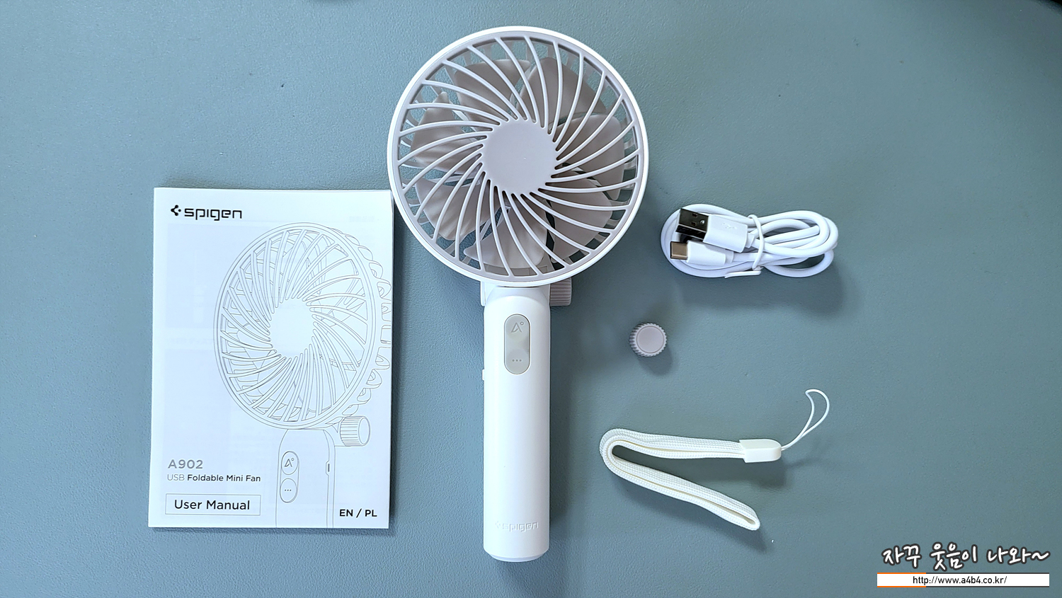 슈피겐 A902 선풍기 제품 구성은 설명서와 선풍기 본체, USB-A to USB-C 타입 충전케이블과 핸드스트랩, 여벌의 힌지너트가 포함되어 있습니다.