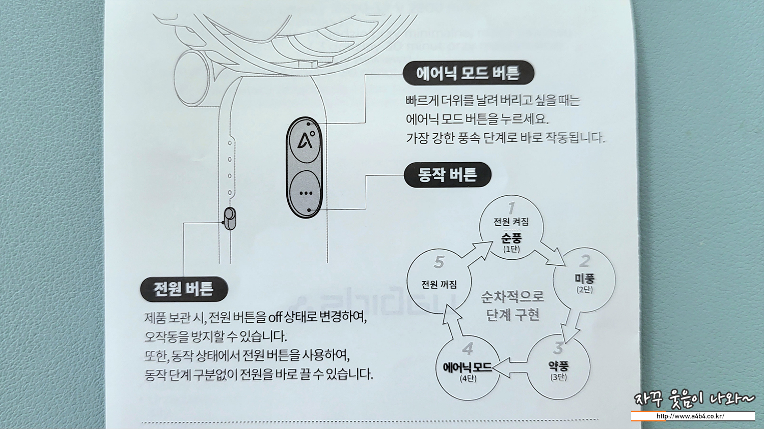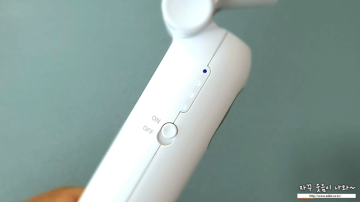 타사의 휴대용 선풍기와 비슷하게 4단 퐁속을 지원합니다. 다안 가방 등에서 오작동 방지를 위한 락버튼 (한 번도 사용 안함)과 전면에도 에어닉모드 버튼으로 한 번에 가장 강한 바람을 일으키는 버튼이 있습니다.