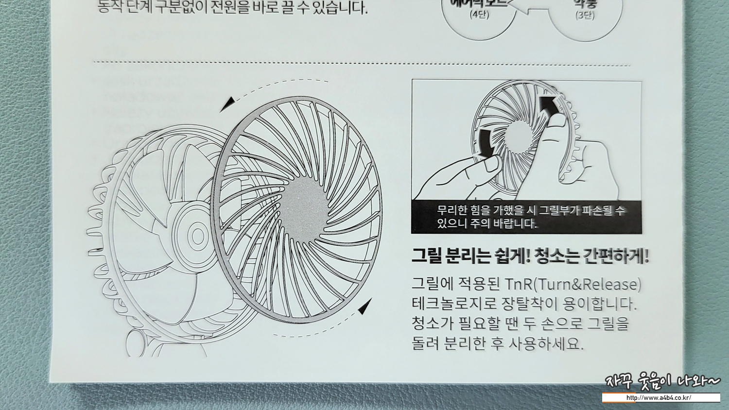 전면 플라스틱망을 회전하면 망이분리되면서 세척이 가능합니다. 슈피겐 선풍기 프로펠러는 분리되지 않습니다. 우선 물티슈 등으로 닦을 수 있는 부분은 좋네요.