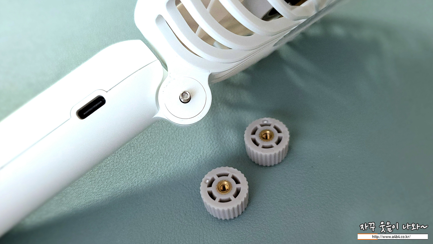 슈피겐 휴대용 선풍기 단점입니다. 사진과 같이 목 부분이 접히게 되어있고, 고정을 힌지너트가 하게 됩니다. 이게 다소 잘 풀리고 고정을 위해서는 힘이 필요합니다. 점점 힘을주다 보니 약갈 헐거워 지면서 선풍기를 고정하는데 불편이 생기네요.