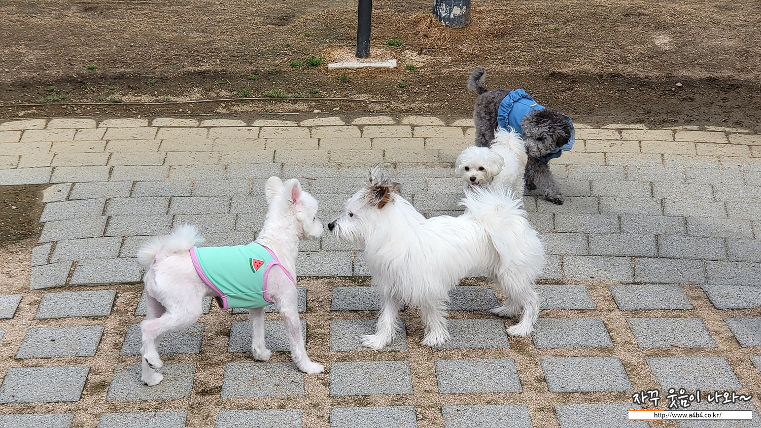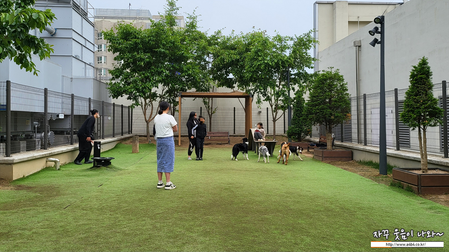 목줄을 다 풀어놓고 놔두니 처음보는 강아지끼리도 너무나도 사이좋게 잘 놀고 있습니다. 얼마나 뛰어 다니는지 장난이 아니네요. 다만 강아지가 볼일을 보거나 트러블이 생기는 경우가 있으니 멀리서라도 게속 지켜보고 있어야 합니다.