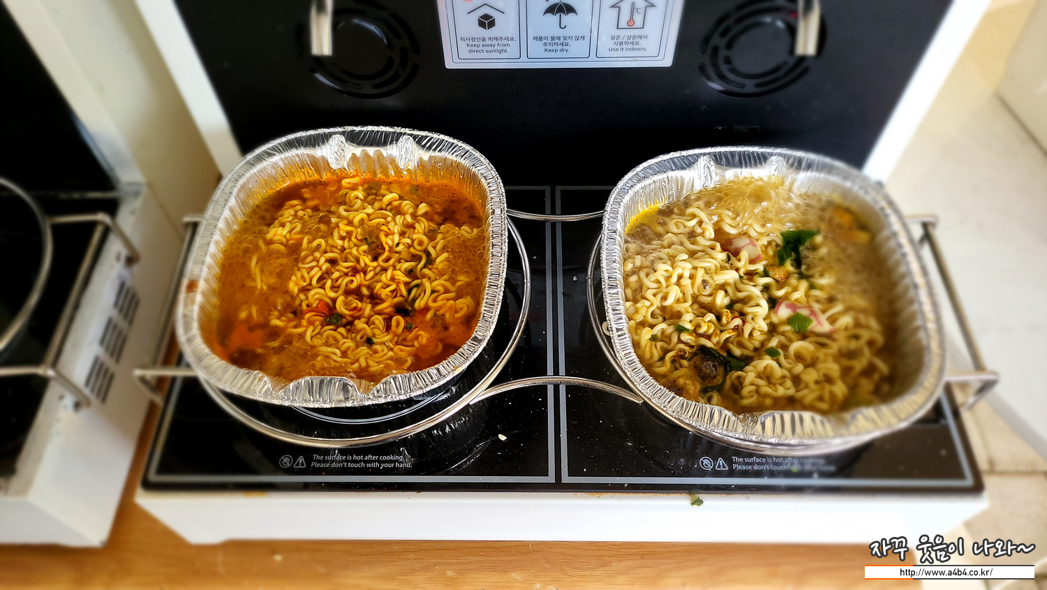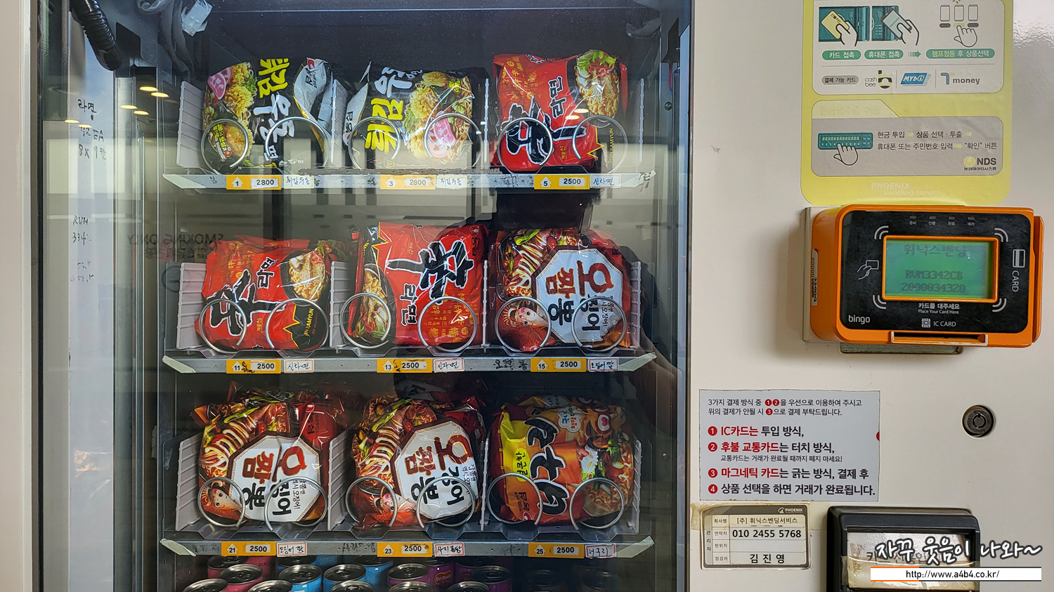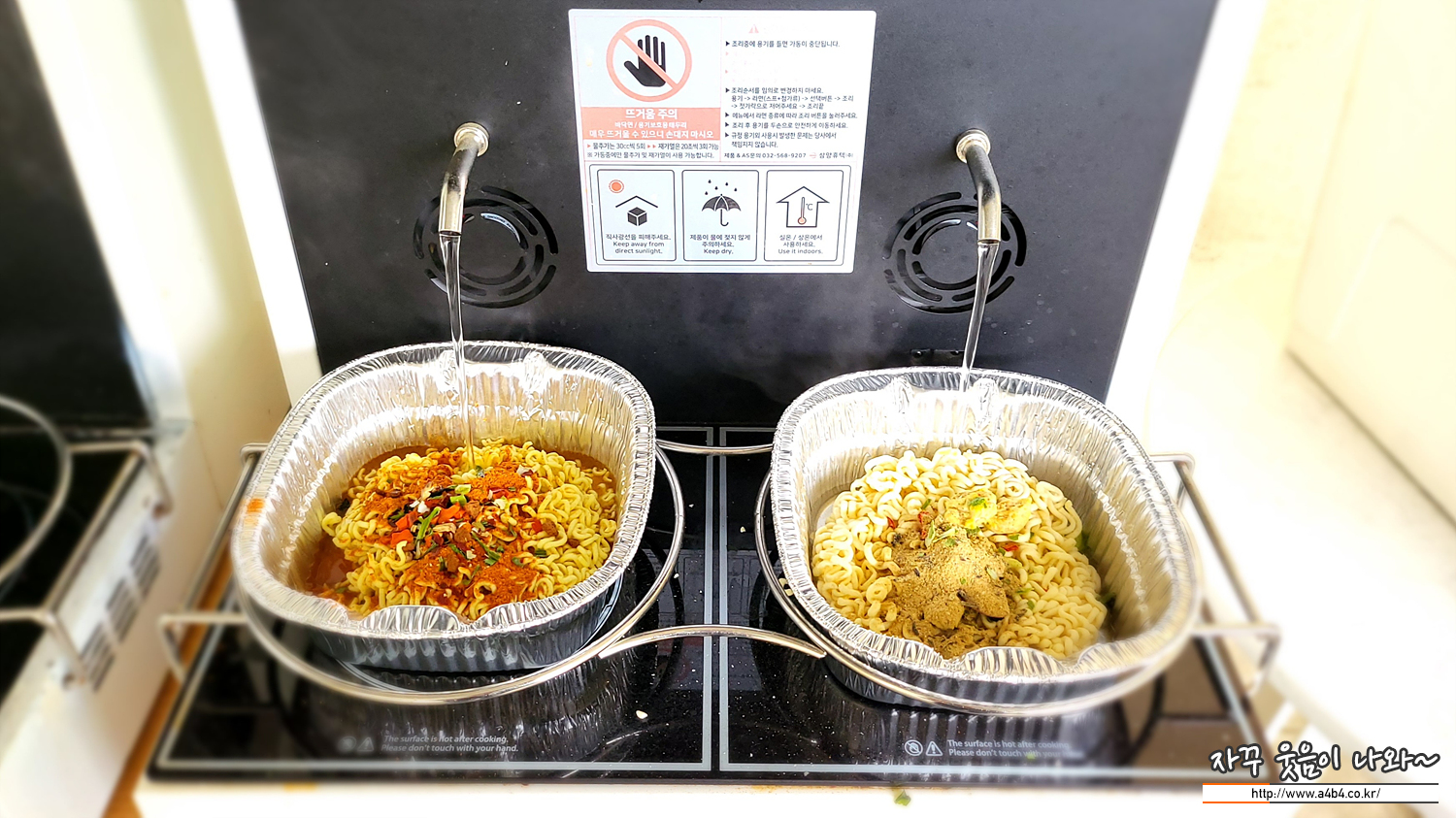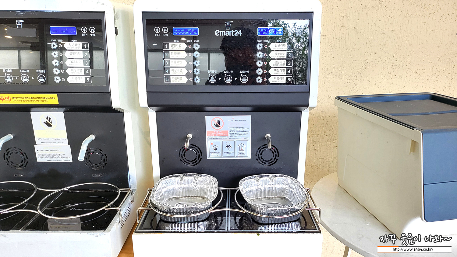 튀김우동, 신라면, 오징어짬뽕, 너구리, 진라면 등이 준비되어 있으며 가격은 2,500원 전후입니다. (용기 및 젓가락 포함) 그리고 바로 즉석해서 라면을 조리해서 먹을 수 있습니다.