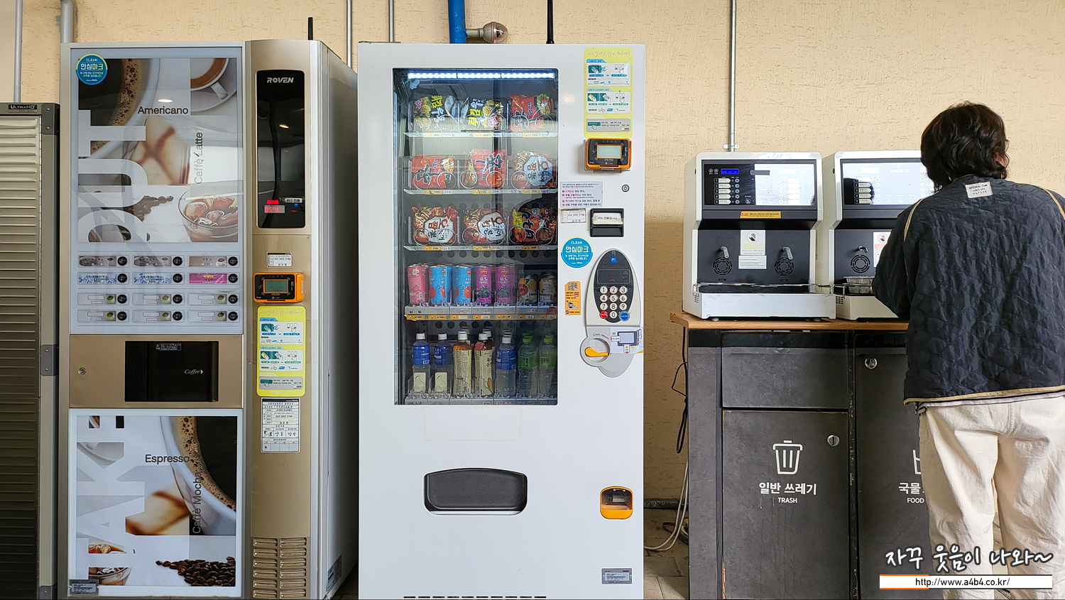 바로 이곳인데요. 흡연 부스와 함께 있는 즉석 라면과 군것질 거리 자판기, 그리고 강아지와 함께 앉아서 먹을 수 있는 공간이 마련되어 있습니다. 흡연부스는 밀폐형이어서 밖으로 냄새가 나지는 않네요.