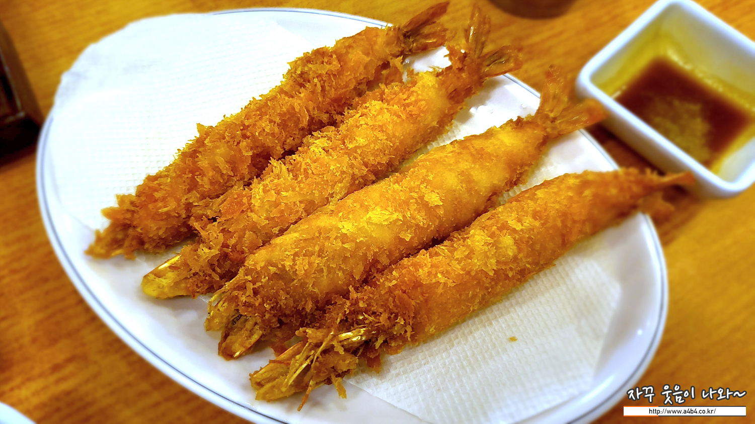 다동돈까스에서 음식 나오기 전에 입가심으로 주문한 새우튀김입니다. 4마리에 10,000원으로 새우튀김 하나에 2,500원 이네요. 튀김옷만 두꺼운 새우튀김은 아니고요. 값 만큼은 합니다.