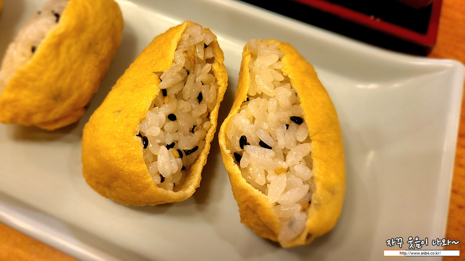 모밀국수와 같이 나오는 유부초밥 4조각입니다. 정식이어서 돈까스 한 조각 나오는 줄 알았는데... 그건 아니군요.