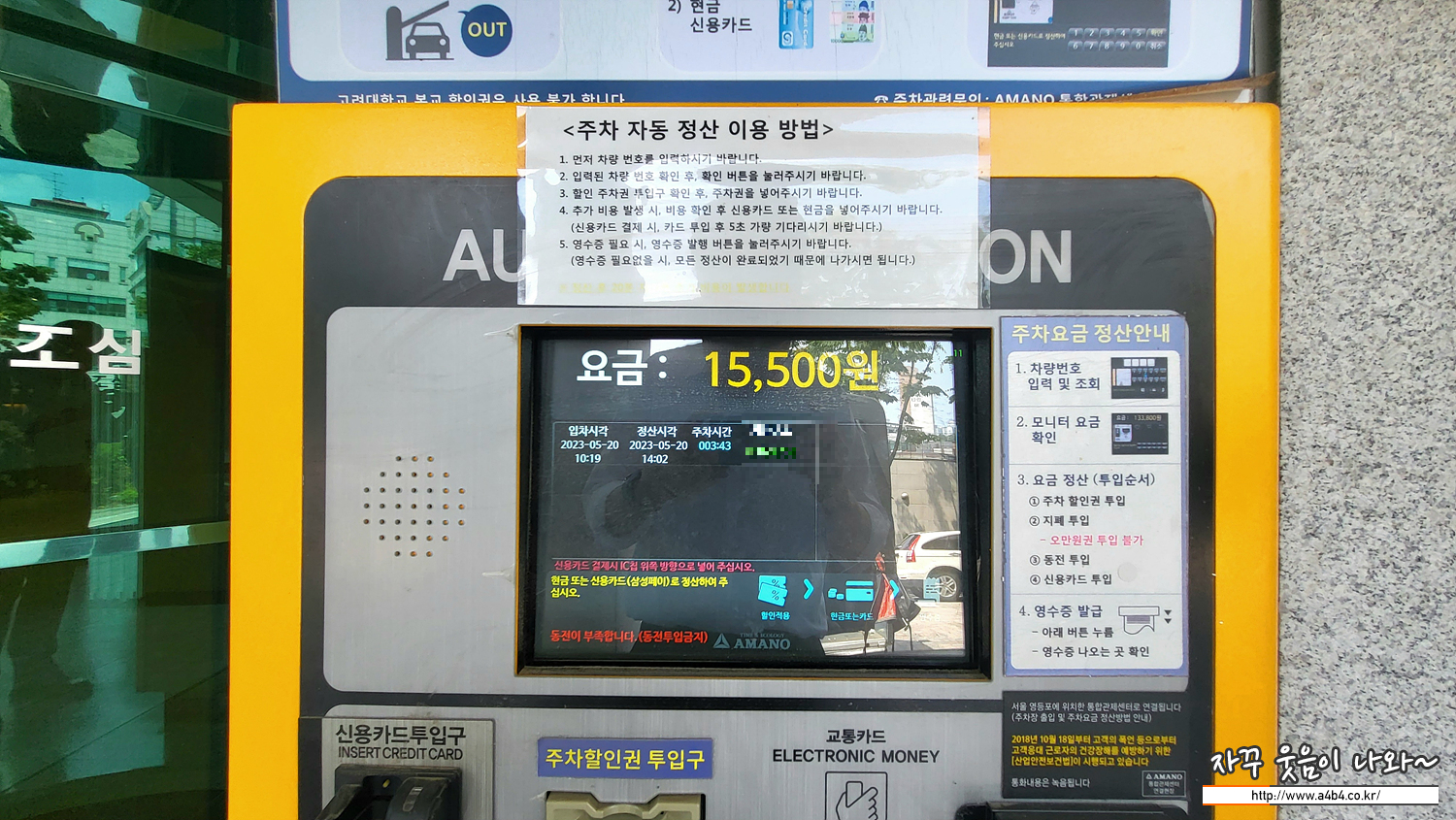 예식장 주차요금은 아래와 같이 초기 두 시간은 10분에 500원 이후에는 10분 당 1천원의 주차요금이 청구됩니다. 결혼식 하객은 2시간 무료 주차권을 받을 수 있고요. 저는 조금 일찍와서 고려대학교 박물관에서 열리고 있는 박물관 개관 50주년 전시회 '지천명에 화답하다' 전시회를 관람했더니 주차 시간이 3시간 43분이 소요 되었네요. 청구 요금은 15,500원이 나왔고요. 2시간 할인 받고 주차요금이 11,000원 나왔습니다. (계산 방식이 약간 이해가...)