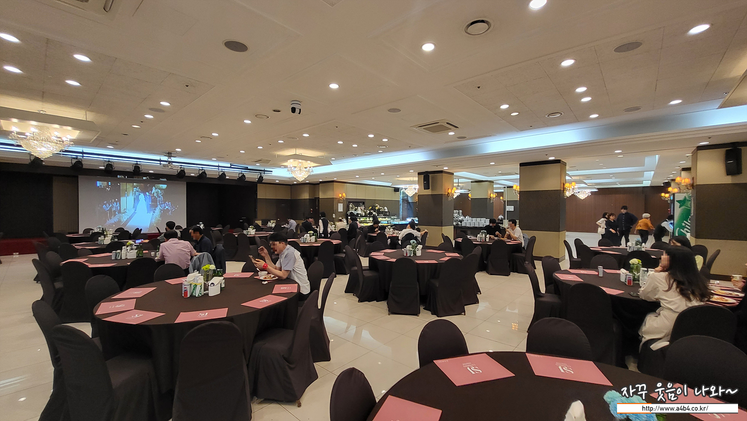 고대 교우회관 예식장은 대략 이런모습입니다. 깔끔한 구성을 보이고요. 식장은 1층 좌측에 식당은 지하에 위치해 있습니다. 식당에서는 스크린을 통해 결혼식 모습을 볼 수 있습니다. 저는 오후에 또 다른 약속이 있어 신랑신부 입장을 보고 바로 지하 식당으로 이동합니다.