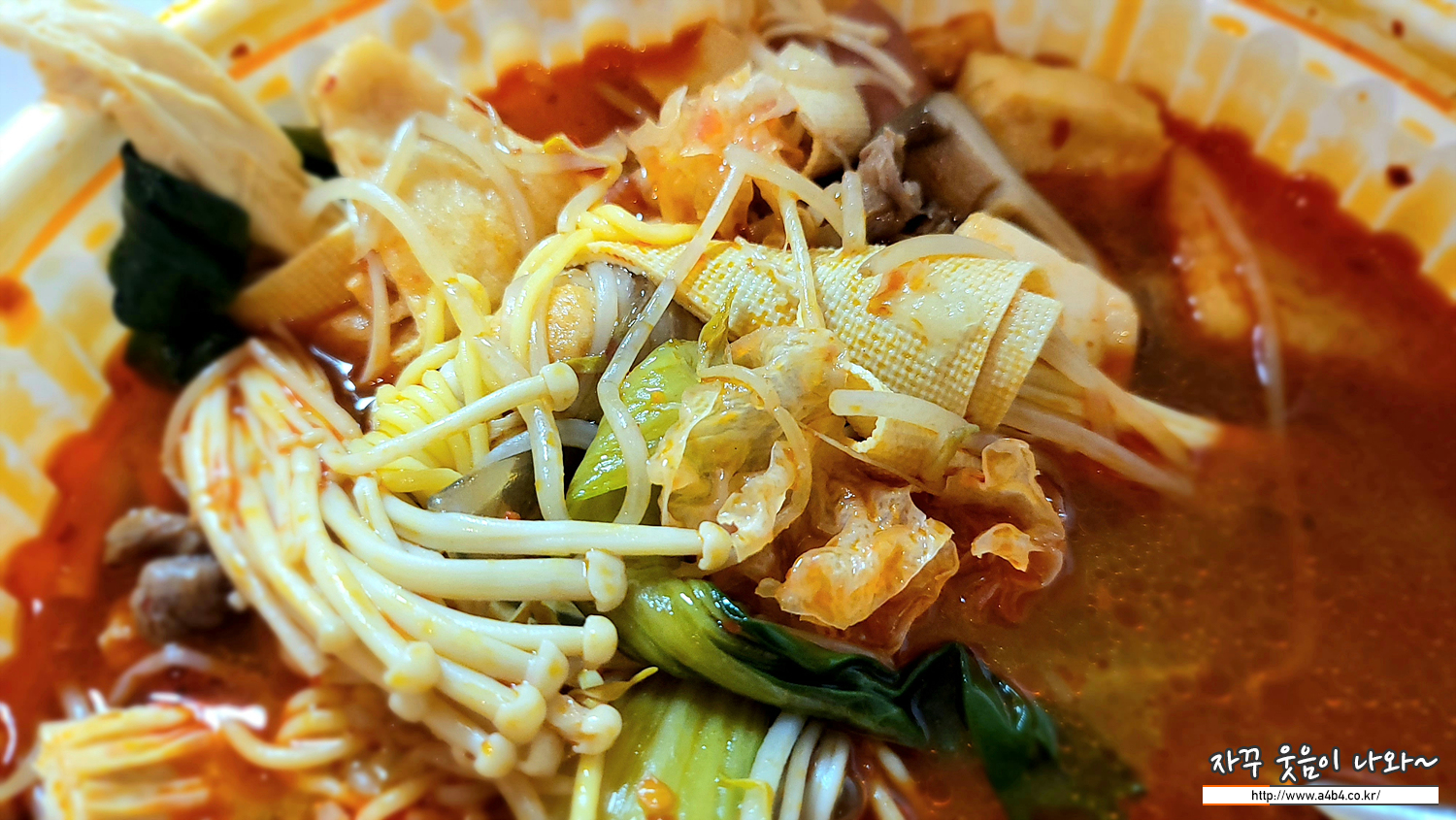 새우볶음밥 세트메뉴 (16,100원)에 나오는 마라탕입니다. 토핑은 숙주, 건두부, 푸주, 알배기,청경채,팽이버섯,백목이버섯,비엔나소세지,옥수수소세지,유부,중국당면,연근,두부피쉬볼,새송이버섯,메추리알,목이버섯,표고버섯,문어피쉬볼이 들어있고 소고기 제외된 조합입니다.