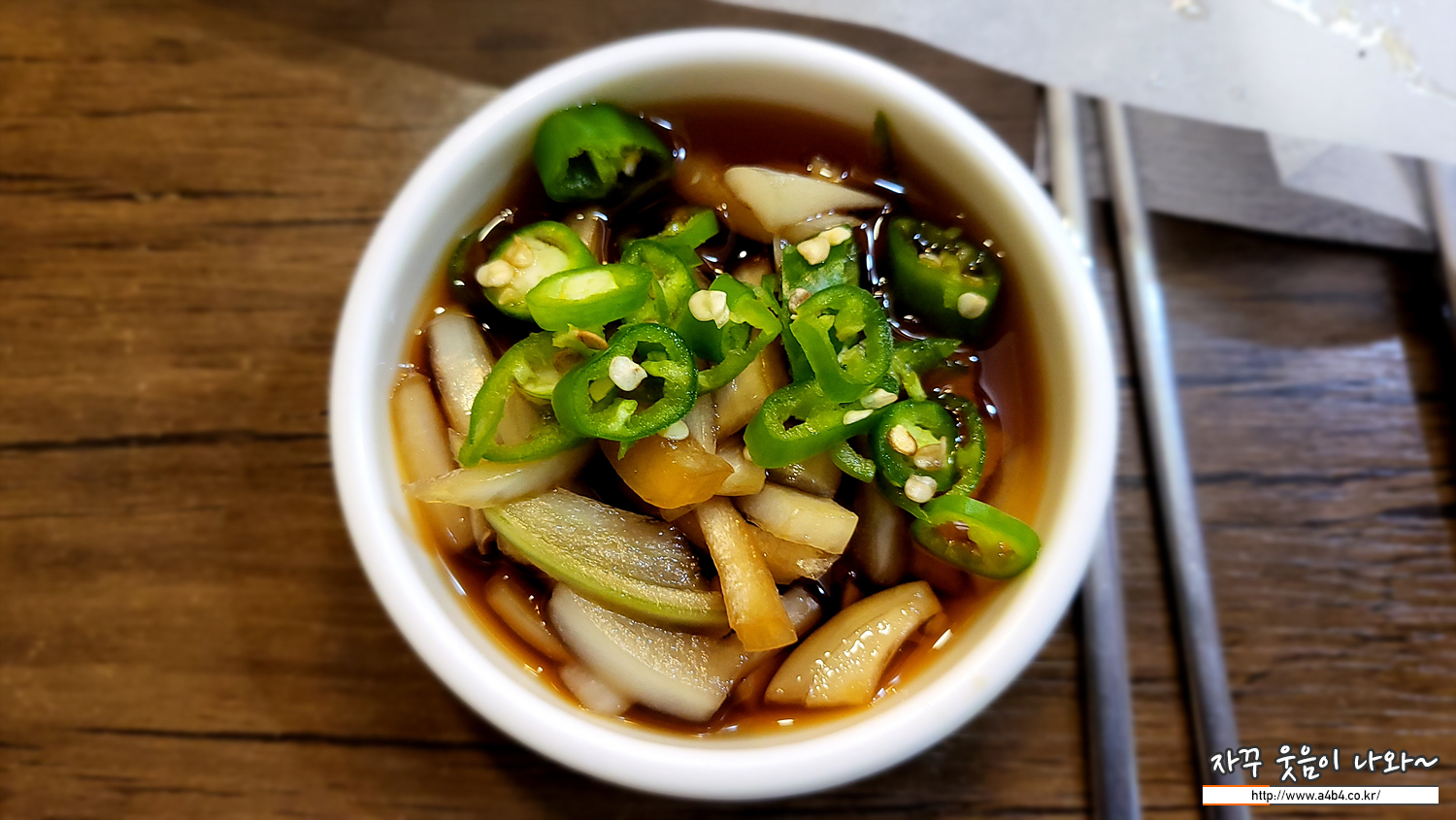 반찬은 김치 하나에 전을 주문하니 양념장 주시네요.