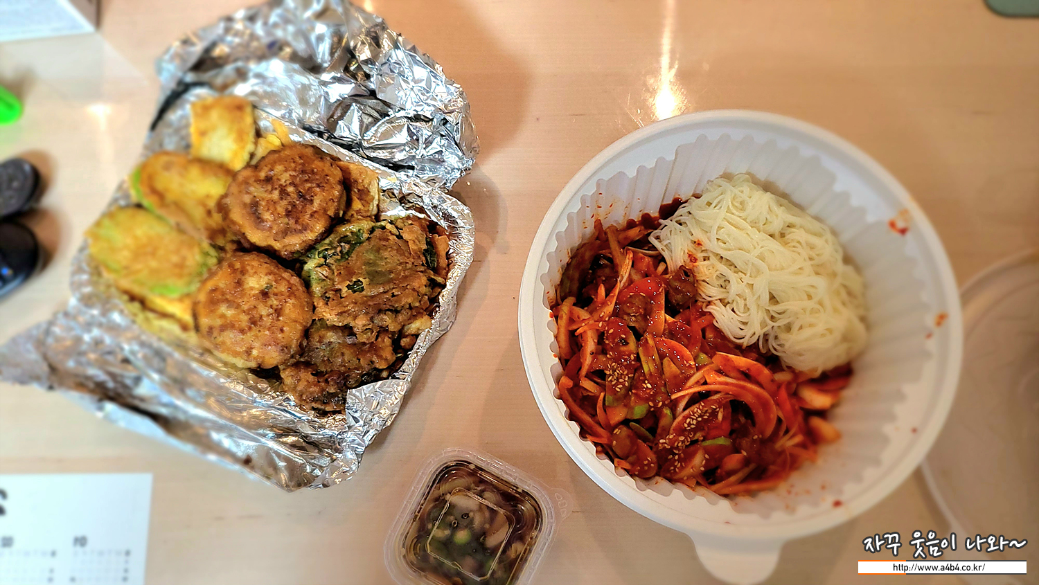 식당에서 먹으려고 한 골뱅이소면과 집에 아이 주려했던 미니모듬전 입니다.