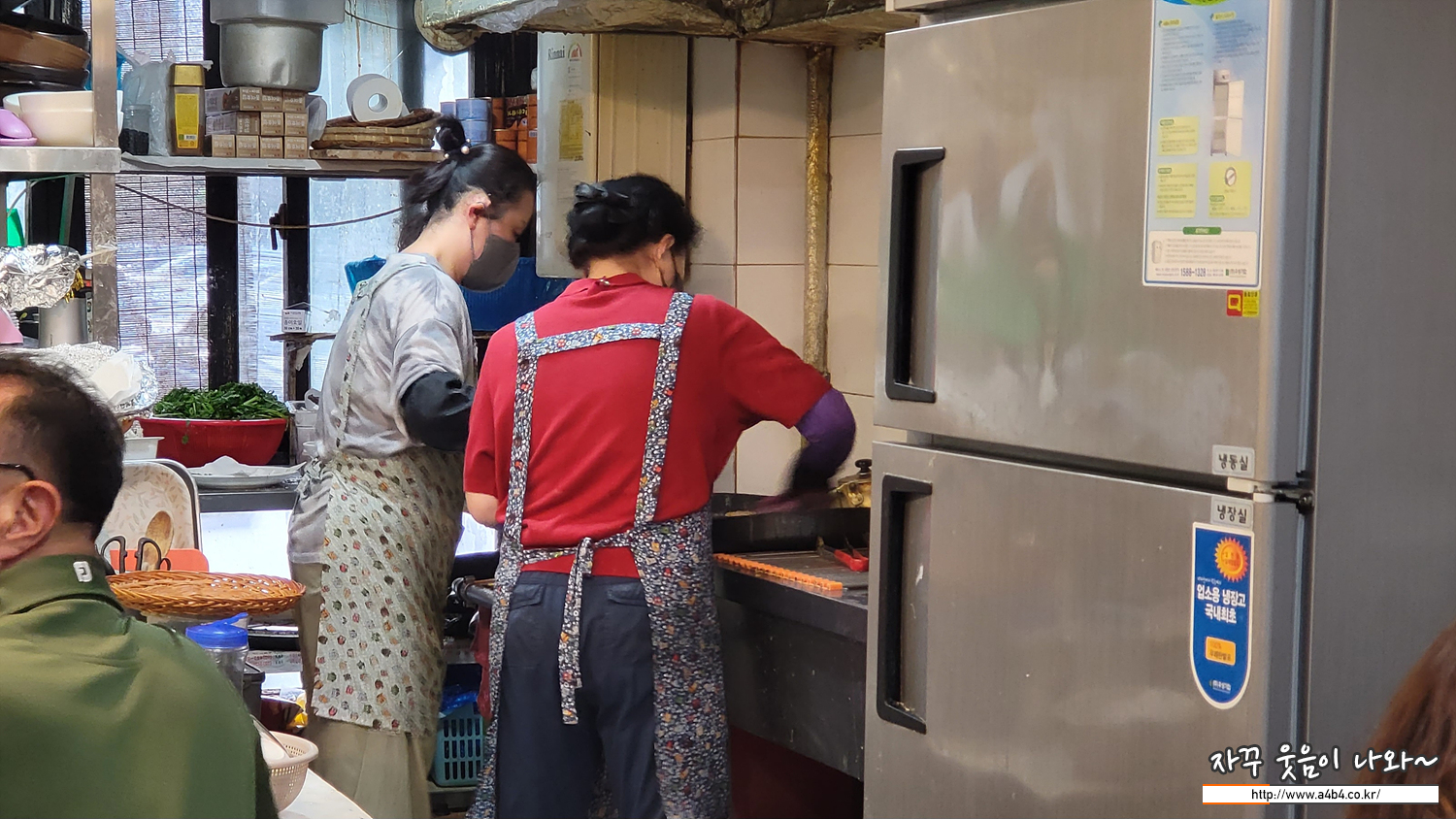 모듬전 맛집에 왔으니 전을 주문해야죠. 저희는 나루모듬전 절반 사이즈인 미니모듬전과 조금 있다 골뱅이소면 주문했습니다. 이모님 세 분께서 쉬지 않고 전을 만들고 있으십니다.
