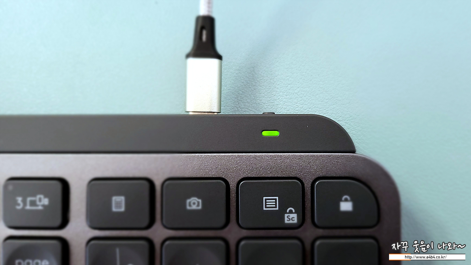 이렇게 키보드에 USB-C 타입 케이블로 충전이 가능합니다. 충전중에는 상단에 램프가 포시되며, 무선 키보드로 사용하는 상태에서 배터가 10% 남았을 경우 붉은 색으로 변경되어 이 때 충전하시면됩니다.