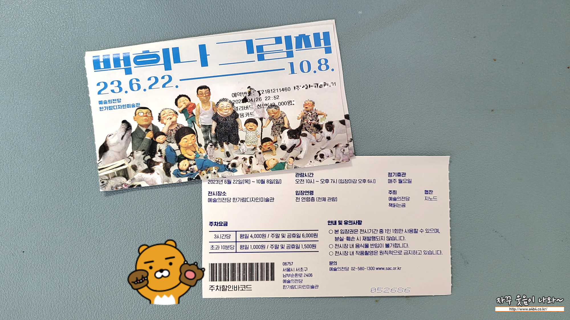 전시회 관람 고객은 사전 주차요금 정신가에서 티켓 뒷면의 주차할인 바코드를 스캔하면 예술의전당 주치장 할인이 가능합니다.
