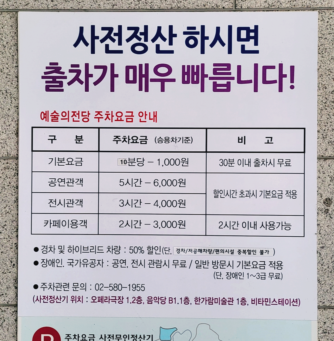 또한 주차요금 자동정산기에서 정산이 불가능하고 주차장 출구에서 직원분 확인하거나 스피커폰을 통해 통화 후 예술의 전당 주차요금 저공해차량 할인이 가능합니다.