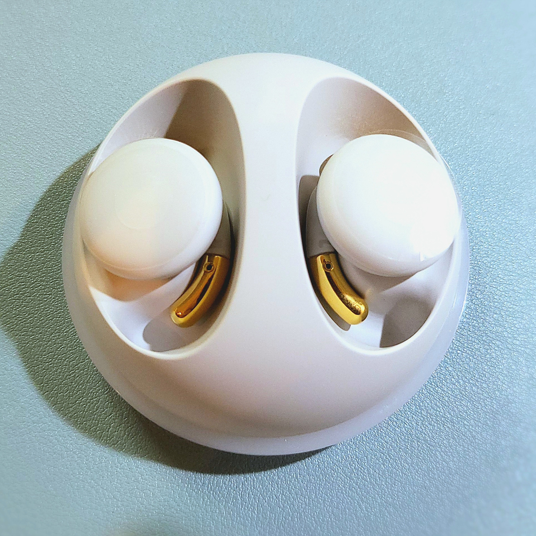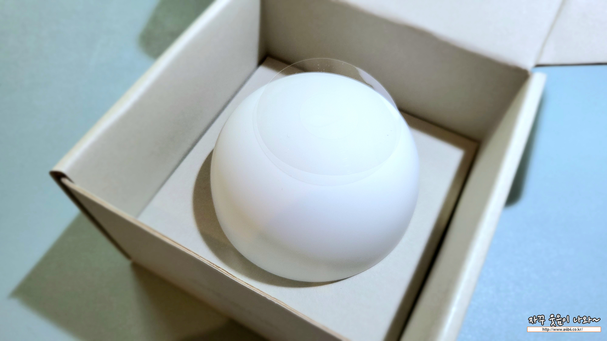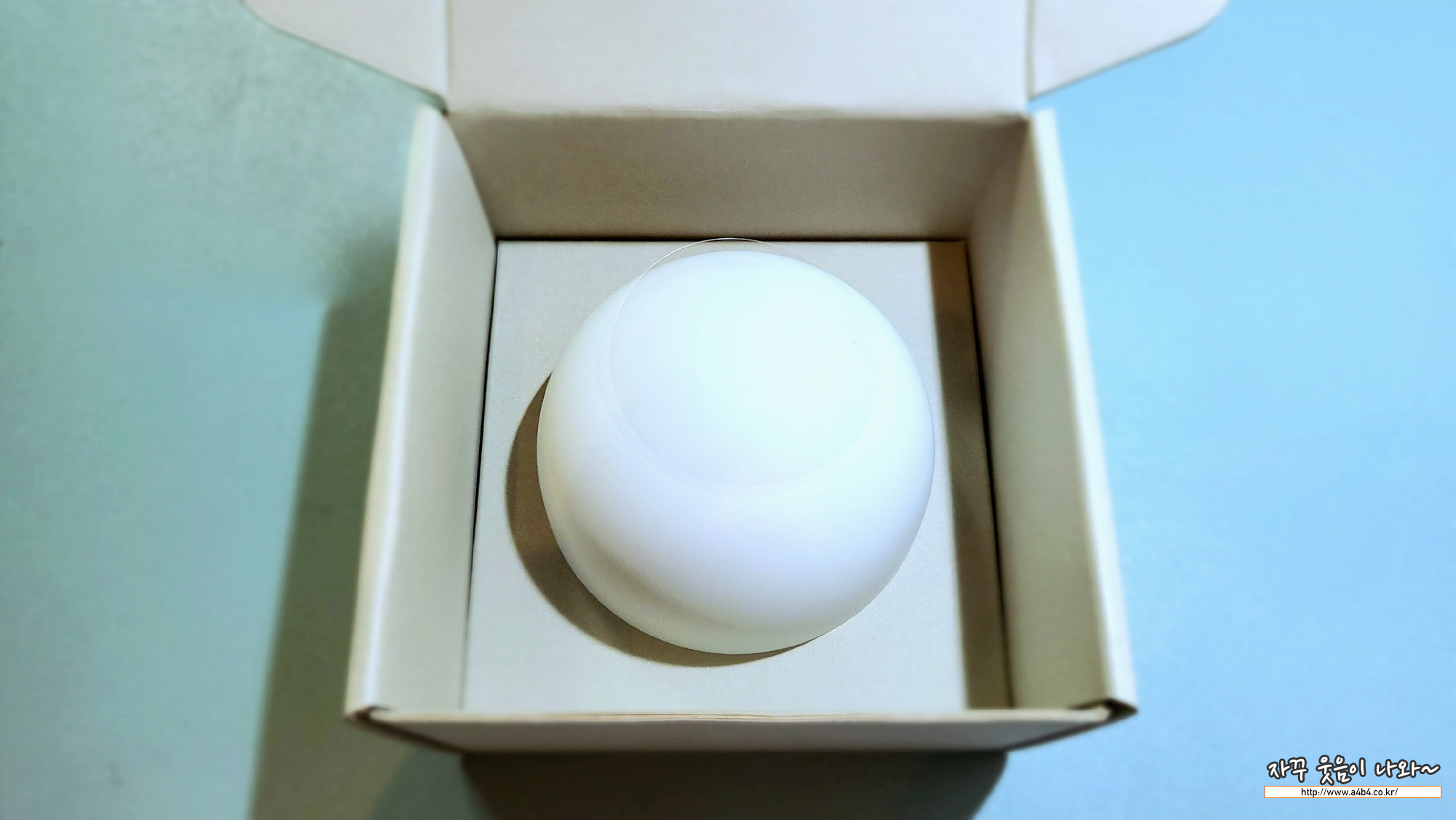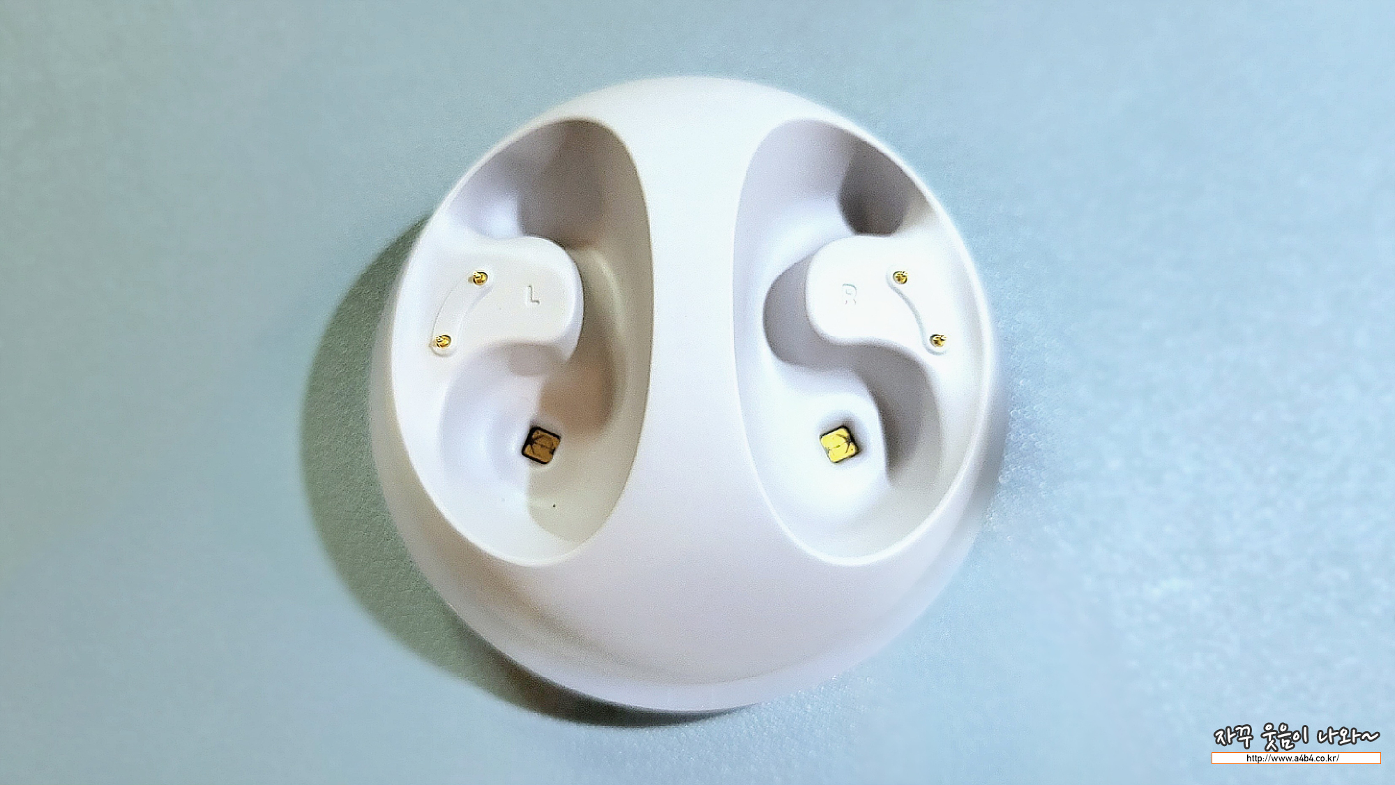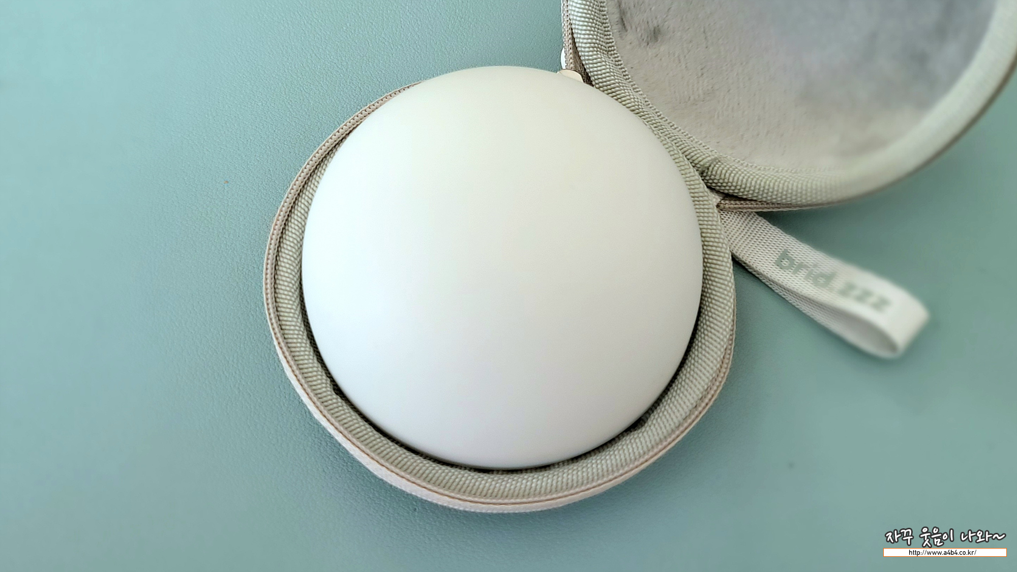 브리즈 박스를 개봉하면 안에는 지름 8cm 정도의 둥근 크래들이 먼저 보이네요. 기대보다는 상당히 큰 크기에 다소 움찔? 합니다. 에어팟 프로2와 비교해 보시면 대략적인 크기를 느끼실 수 있습니다.