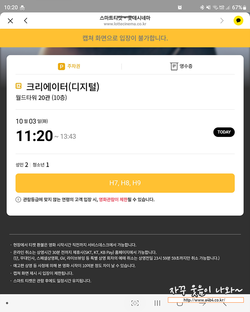 조금 늦게 예약해서 저는 한 줄 앞인 H열 7번 8번 9번 좌석을 예약 했는데요. 사진은 H열 10번 좌석에서 촬영했습니다. 롯데시네마 월드타워 20관 명당자리는 아니지만 그럭저럭 영화 감상하기에 큰 무리 없었던 자리입니다.