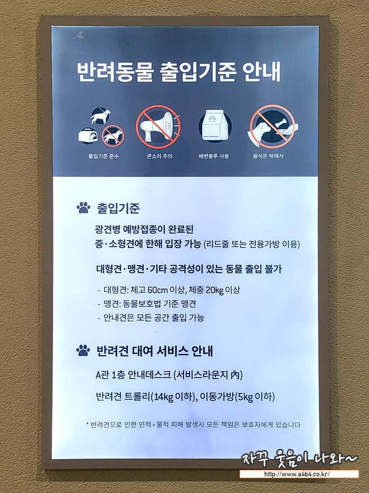 다산 현대아울렛 반려동물 출입기준은 광견병예방접종이 완료된 중소형견에 한합니다. 다만 광견병 예방접종 이력을 확인하지는 않습니다. 그리고 별도 출입조건을 확인하는 절차도 없습니다. 사실 입장 제한은 없음
