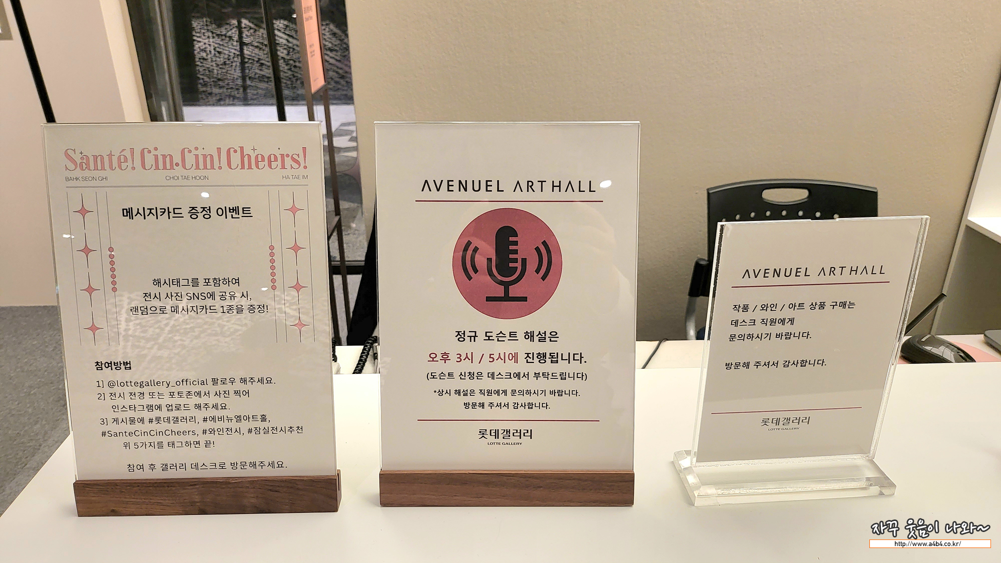 이번 전시회는 오후 3시와 5시 2회의 도슨트가 진행됩니다. 또한 작품기념엽서 및 와인을 만나볼 수 있습니다.