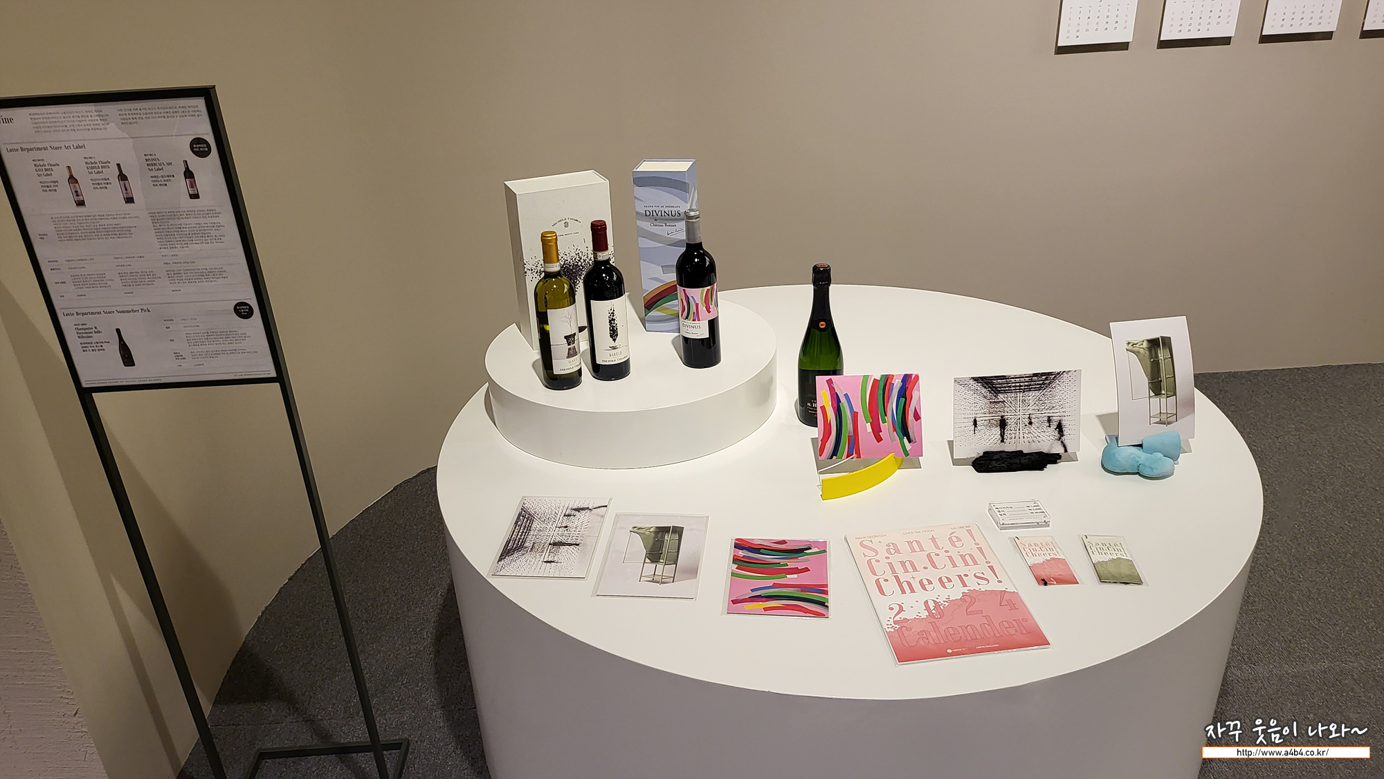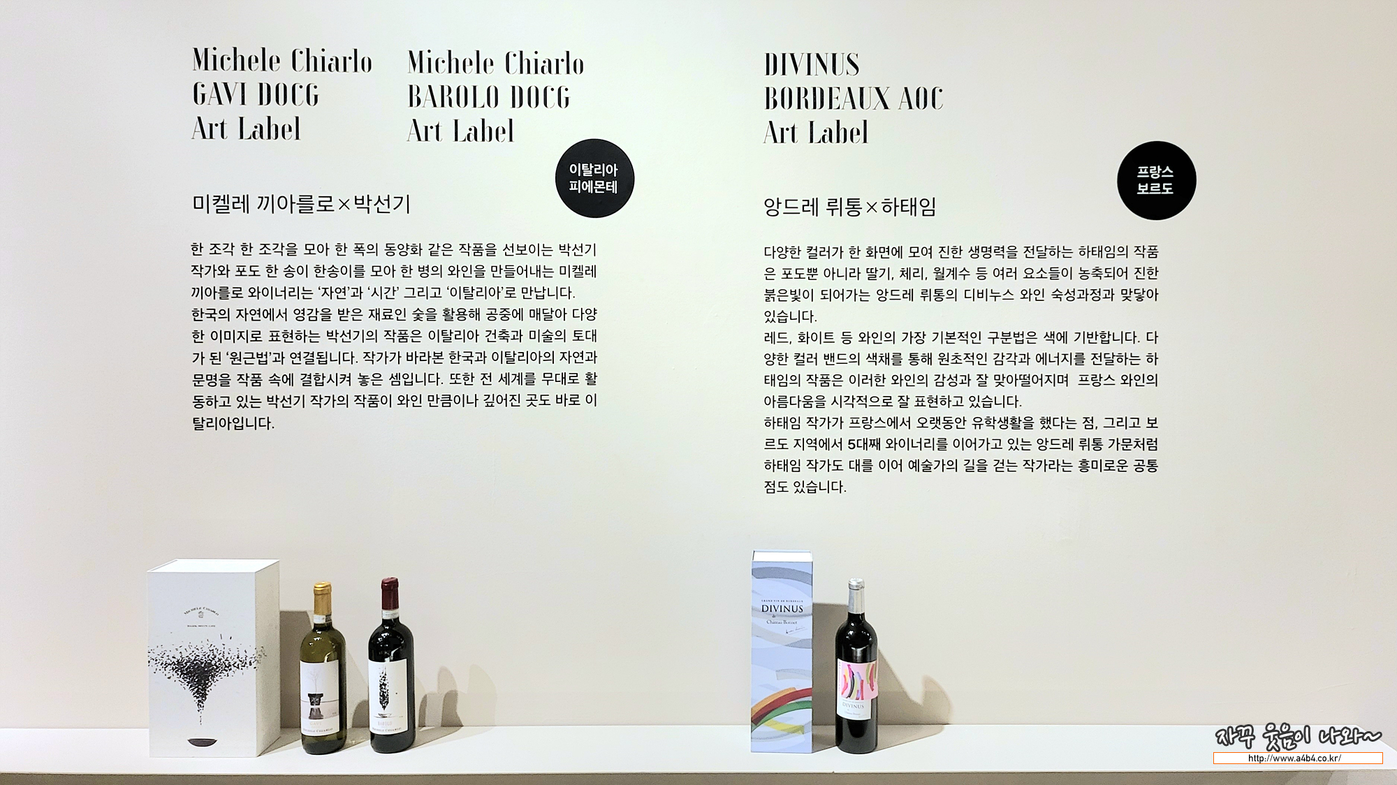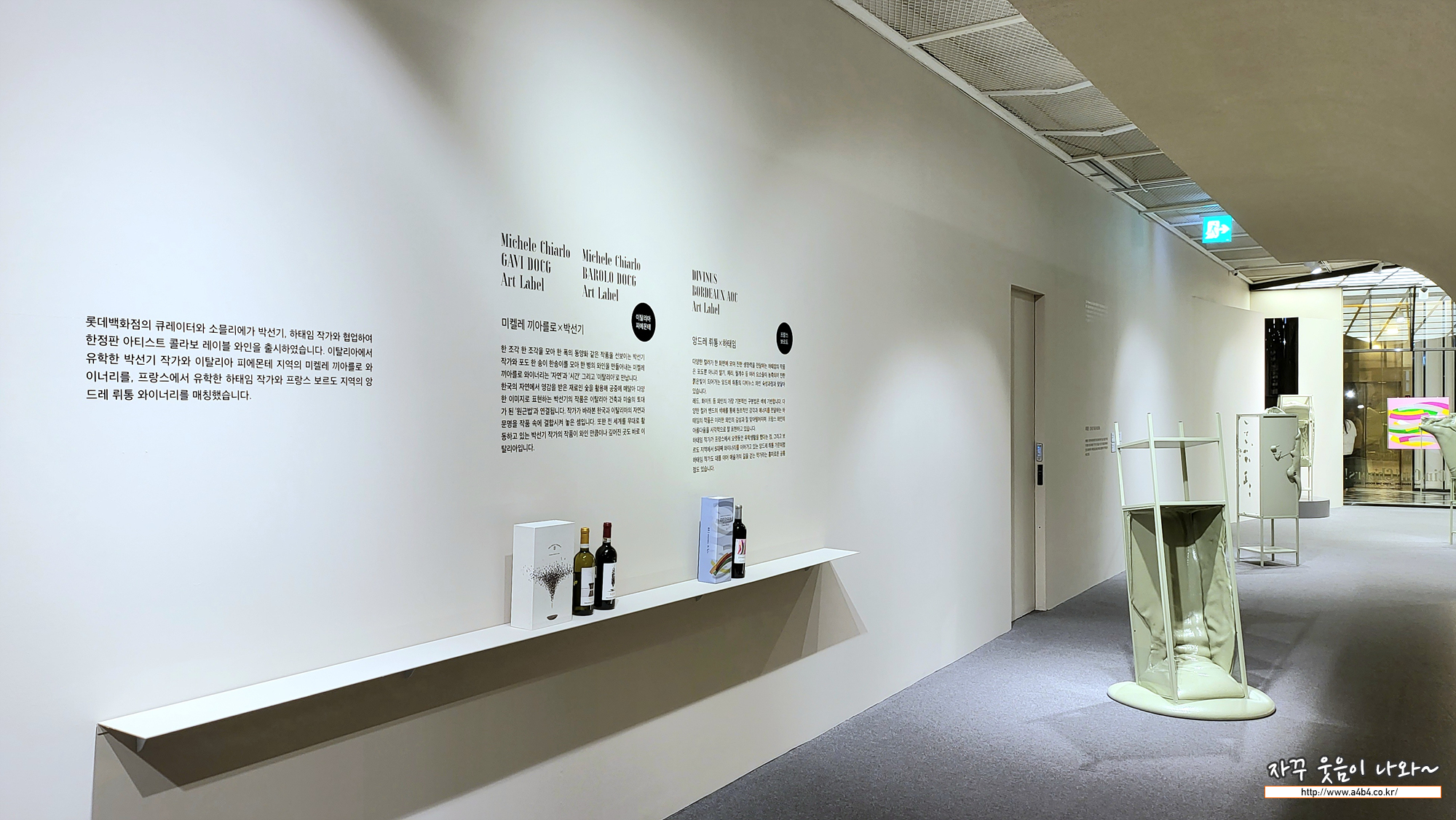 이번 롯데갤러리 잠실 전시의 시작은 박선기, 하태임 작가의 작품과 와인 콜라보 작품으로 시작합니다. 그들의 작품과 콜라보된 와인 패키지를 만나볼 수 있습니다.