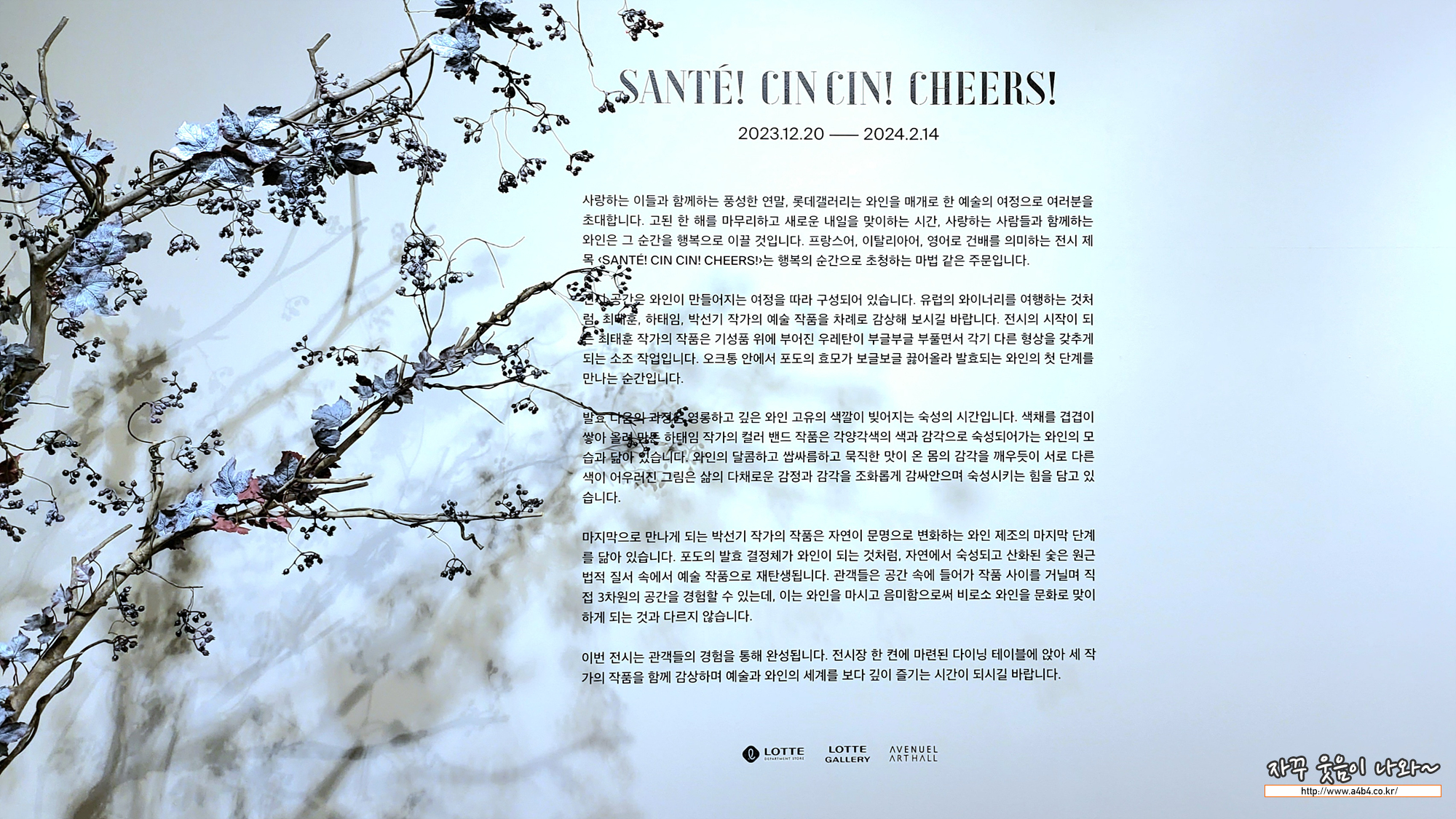 이번 Santé! Cin Cin! Cheers! 전시회는 잠실 롯데월드몰 타워 6층에 위치한 롯데갤러리 잠실에서 2024년 2월 14일까지 열릴 예정입니다.
