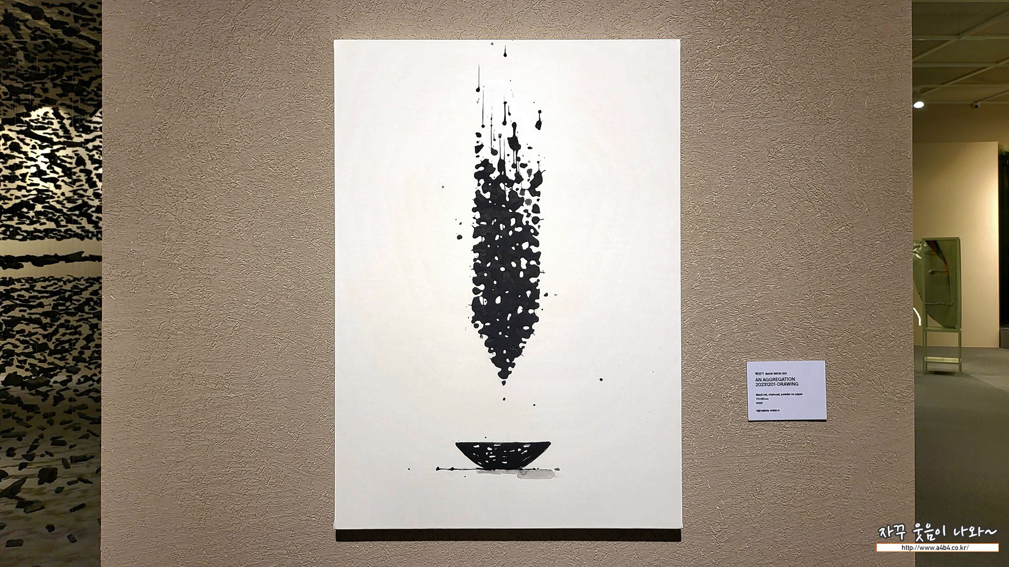 그는 천장에 숯·아크릴 비즈 등을 나일론 줄에 매다는 형태의 독특한 대형 설치작품 활동을 주로 하는데요. 이번 Santé! Cin Cin! Cheers! 전시회에서도 숯으로 작업한 대형 작품을 선보였습니다.