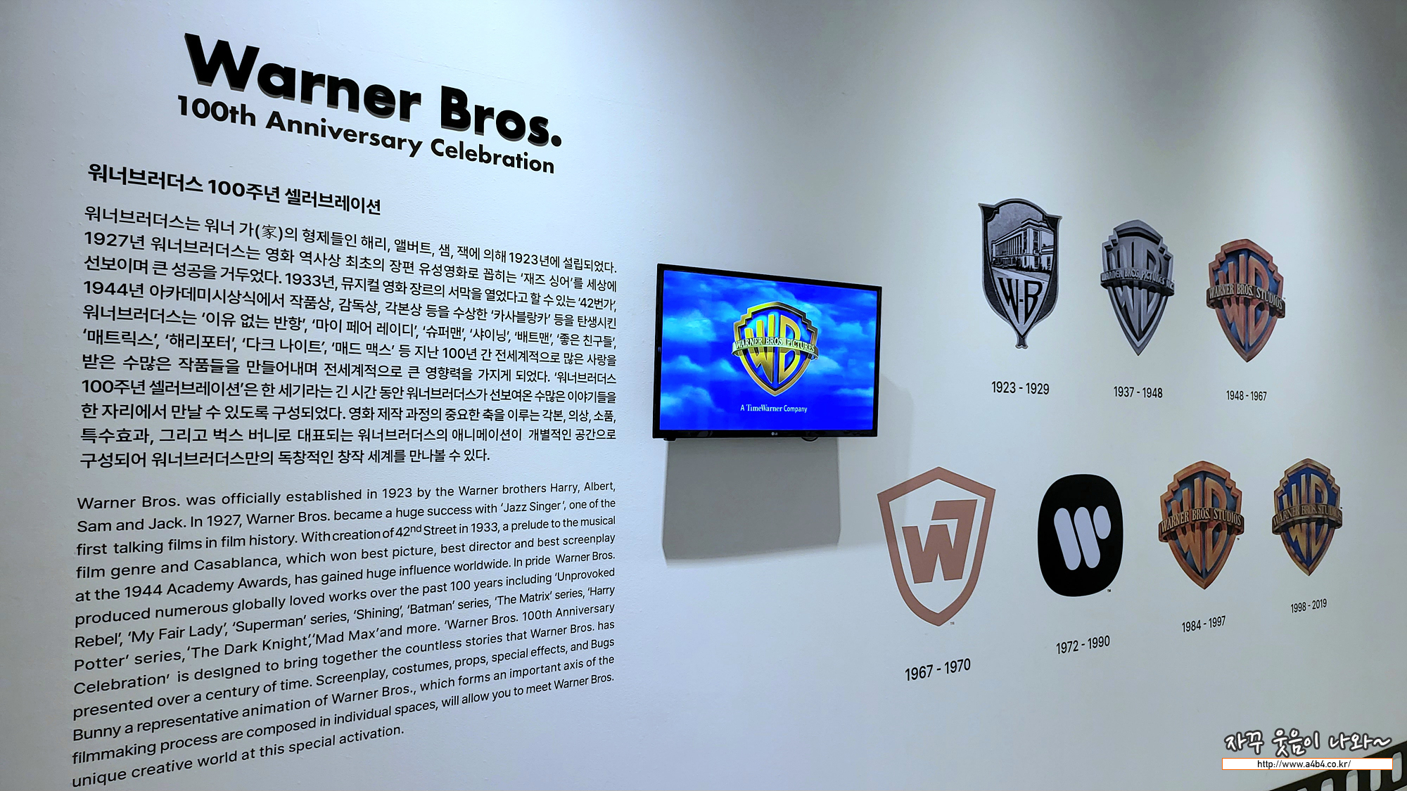 워너 브라더스 100주년 특별전 첫 시작은 워너브라더스 역사가 소개됩니다. 그 유명한 워너의 로고심볼의 변천사를 만나볼 수 있는데요. 역시 WB 조합의 방패 무늬의 로고심벌이 가장 정감이 가네요.