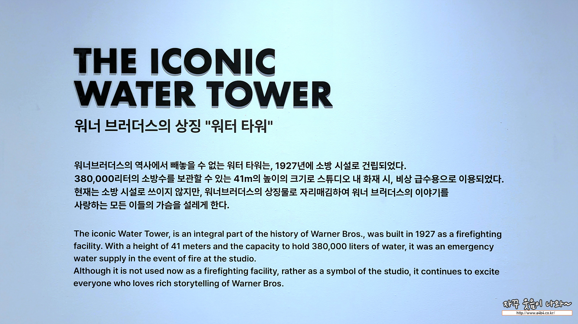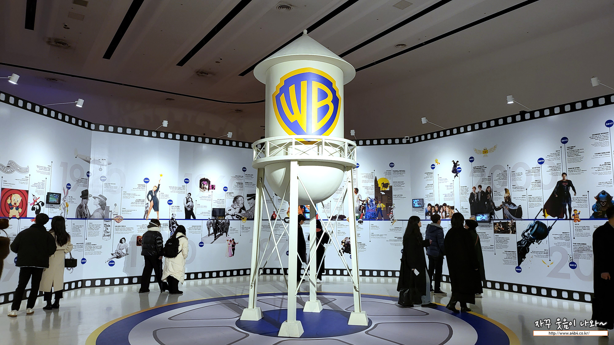 첫 전시 공간은 워너브라더스의 로고심볼 변천사는 물론 연도별 워너의 역사가 둥근 방에 전시되어 있습니다. 방 중앙에는 워너브라더스의 상징인 '워터 타워' 축소모형이 전시되어 있습니다. 원 워터타워는 41미터 높이의 거대한 소방탑이라고 하네요. 이 앞에서 사진 한 장~