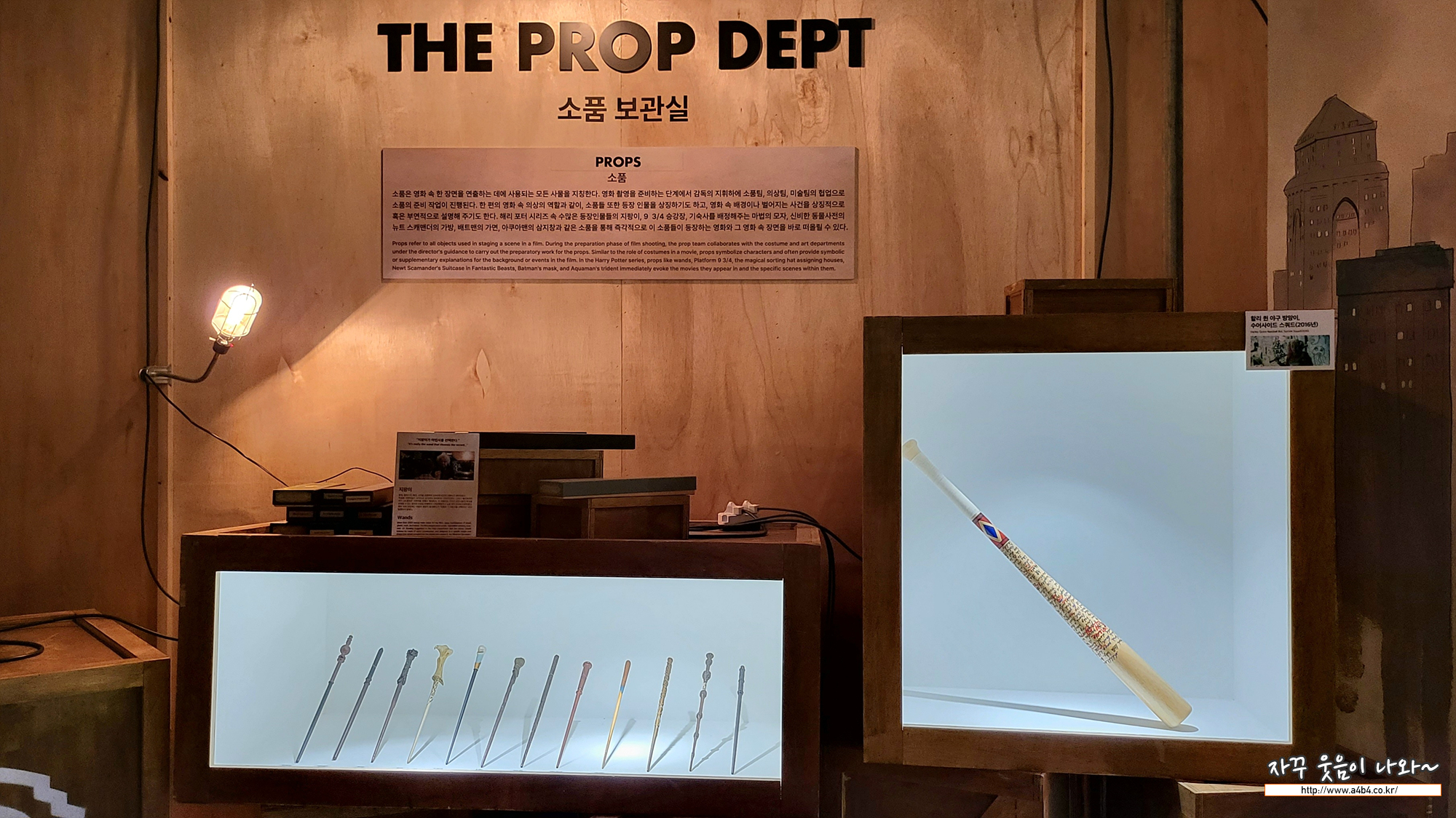 먼저 해리포터의 주인공들이 사용하는 다양한 마법 지팡이가 전시되어 있습니다. 지팡이와 지팡이의 주인공들이 표시되어 있는데요. 쪼그리고 앉아서 보려니 힘드네요. 오른쪽은 수어사이드 스퀴드 여주인 할리퀸이 사용하던 야구 방망이 입니다.
