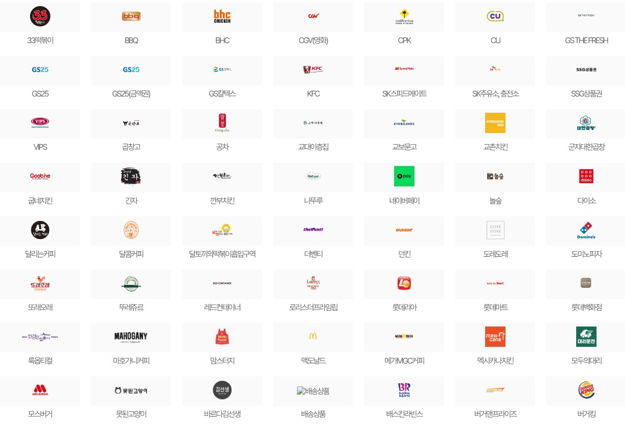 우선 돌잔치 결혼식 답례품으로 기프티콘 대량발송을 생각하신다면, 편의점부터 커피전문점, 떡집, 치킨 등 먹거리. 여기에 정관장, 올리브영 등 생활용품 전문점 기프티콘까지 다양한 카테고리의 상품이 준비되어 있습니다.