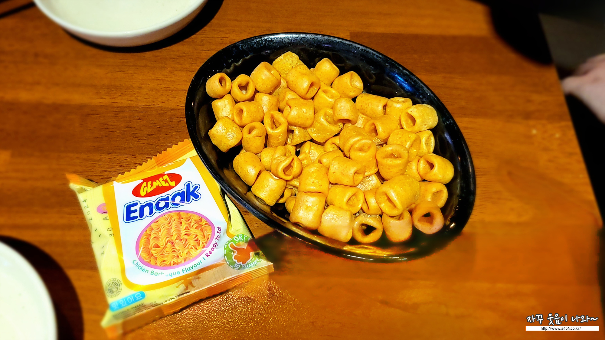 기본 반찬은 에낙 (enaak) 과자와 마카로니 강냉이가 기본 반찬으로 나옵니다.