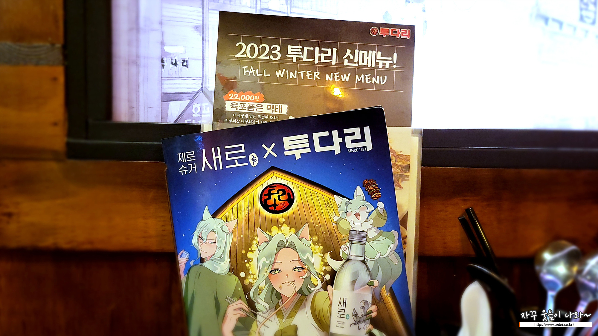 투다리 메뉴판은 새로 소주와 콜라보 했네요. 상당히 독특한 메뉴 표지를 보입니다. 먼저 엄청나게 많은 투다리 메뉴 소개합니다. (메뉴판 클릭하면 크게 확대됩니다.)